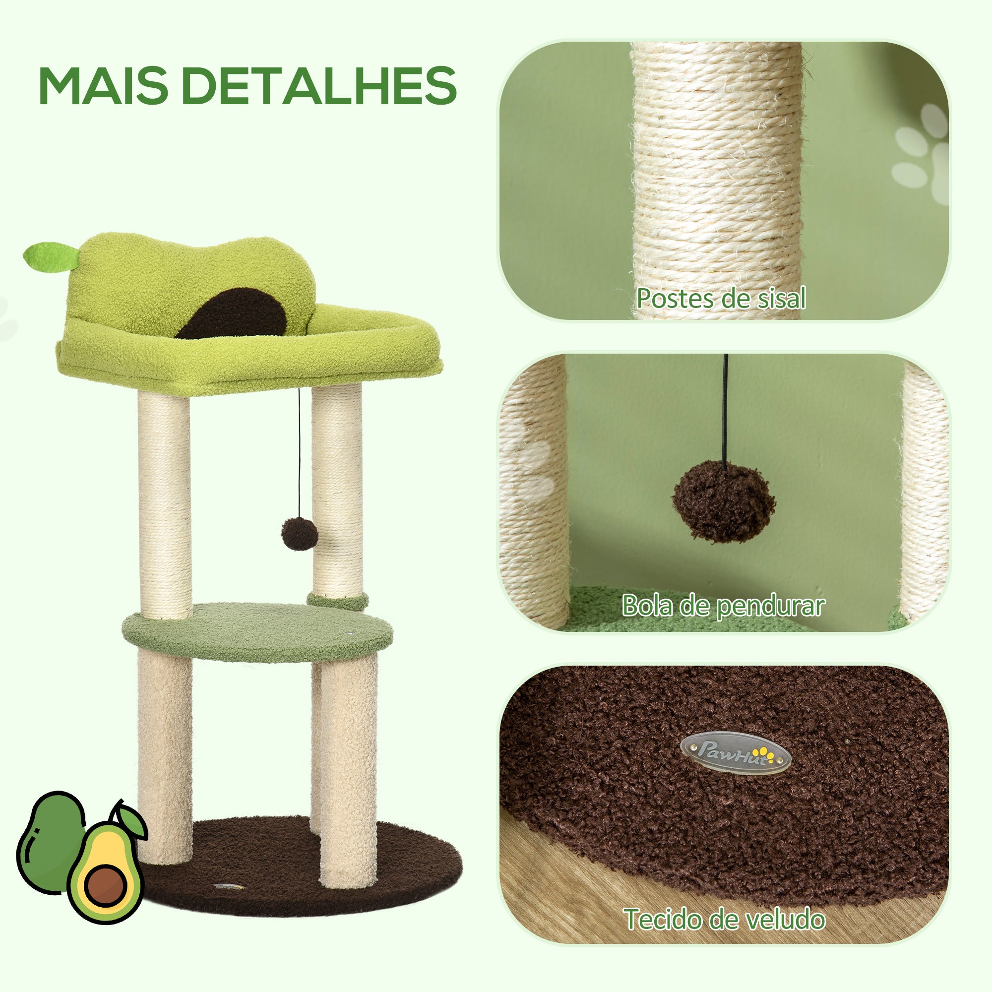 - Benefícios: Estrutura estável, estofado em veludo macio, postes de corda de sisal para afiar as garras, cama confortável, bola suspensa para diversão