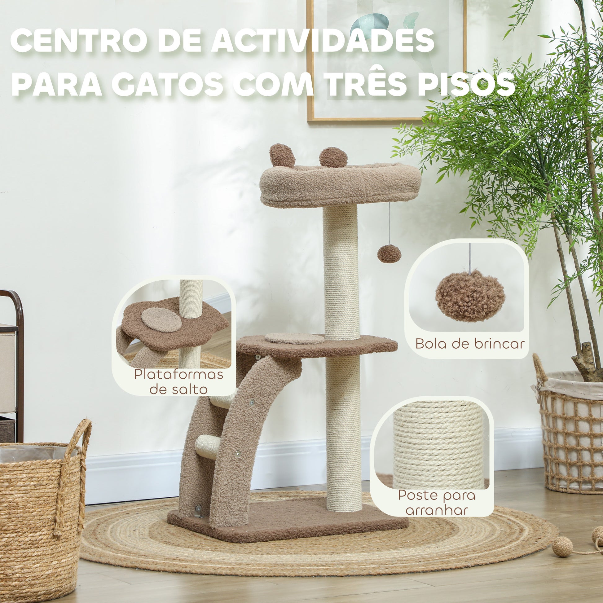 Proporcione ao seu gato um espaço divertido e aconchegante com este arranhador de 3 andares. Inclui postes para arranhar, plataforma, escada, bola suspensa e cama para momentos de relaxamento.