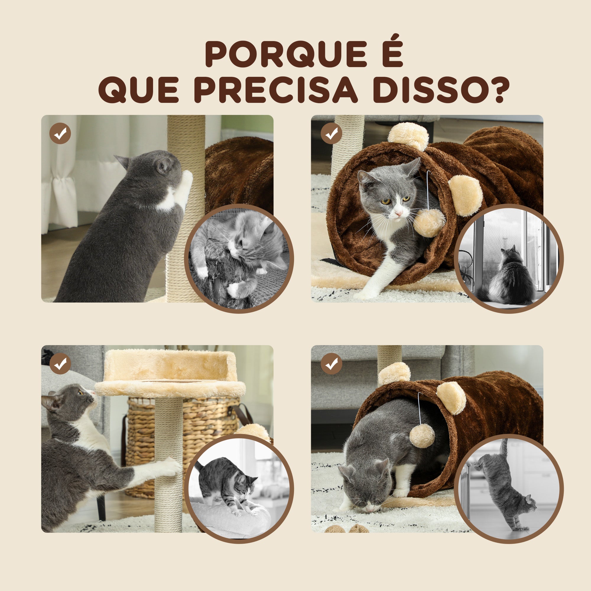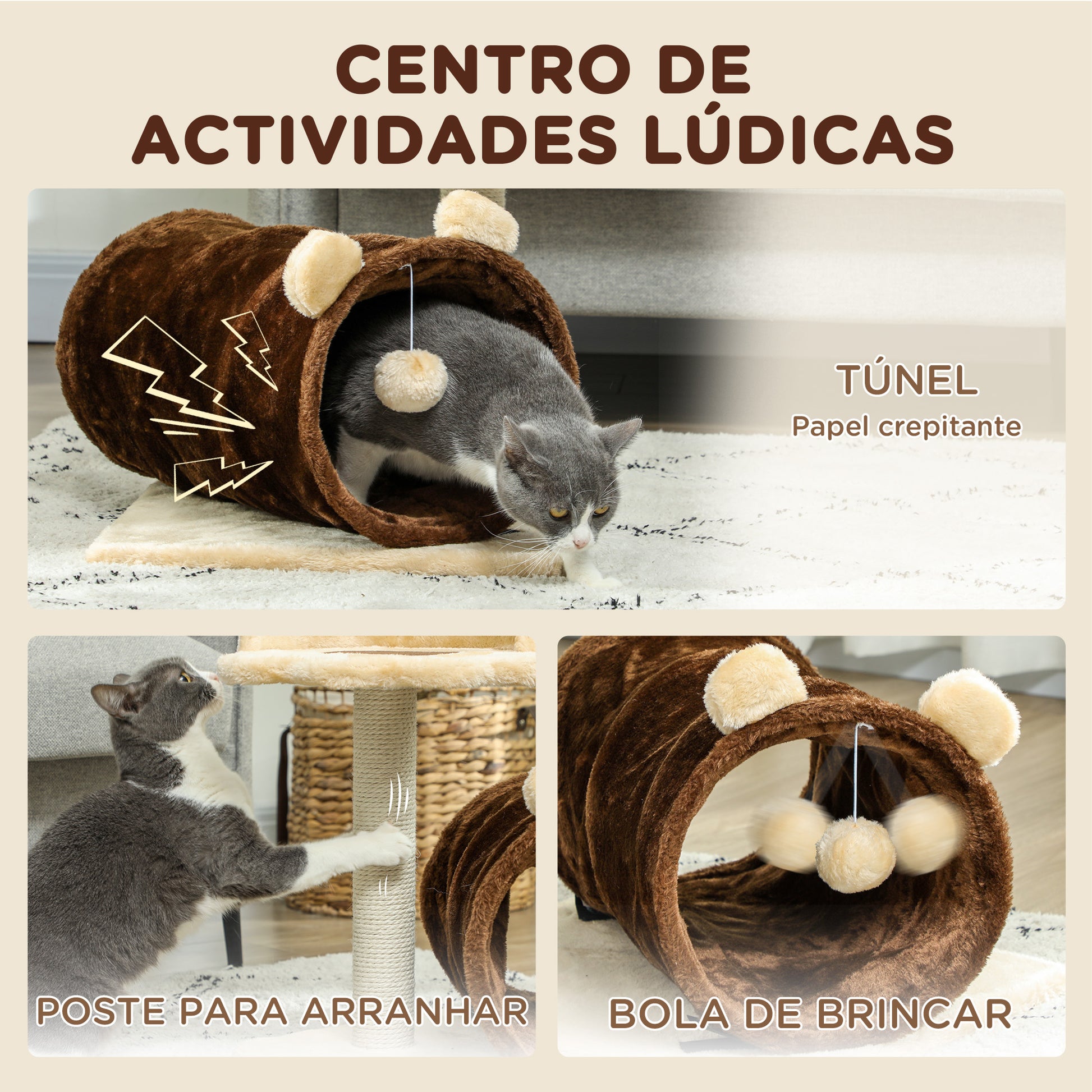 Este arranhador compacto para gatos é o centro de atividades perfeito para entreter e exercitar o seu felino. Inclui um poste revestido em juta para manter as garras saudáveis e afiadas, uma cama aconchegante para sonecas relaxantes, um túnel com papel sonoro que desperta a curiosidade do seu pet e uma bola de brinquedo para garantir horas de diversão contínua.