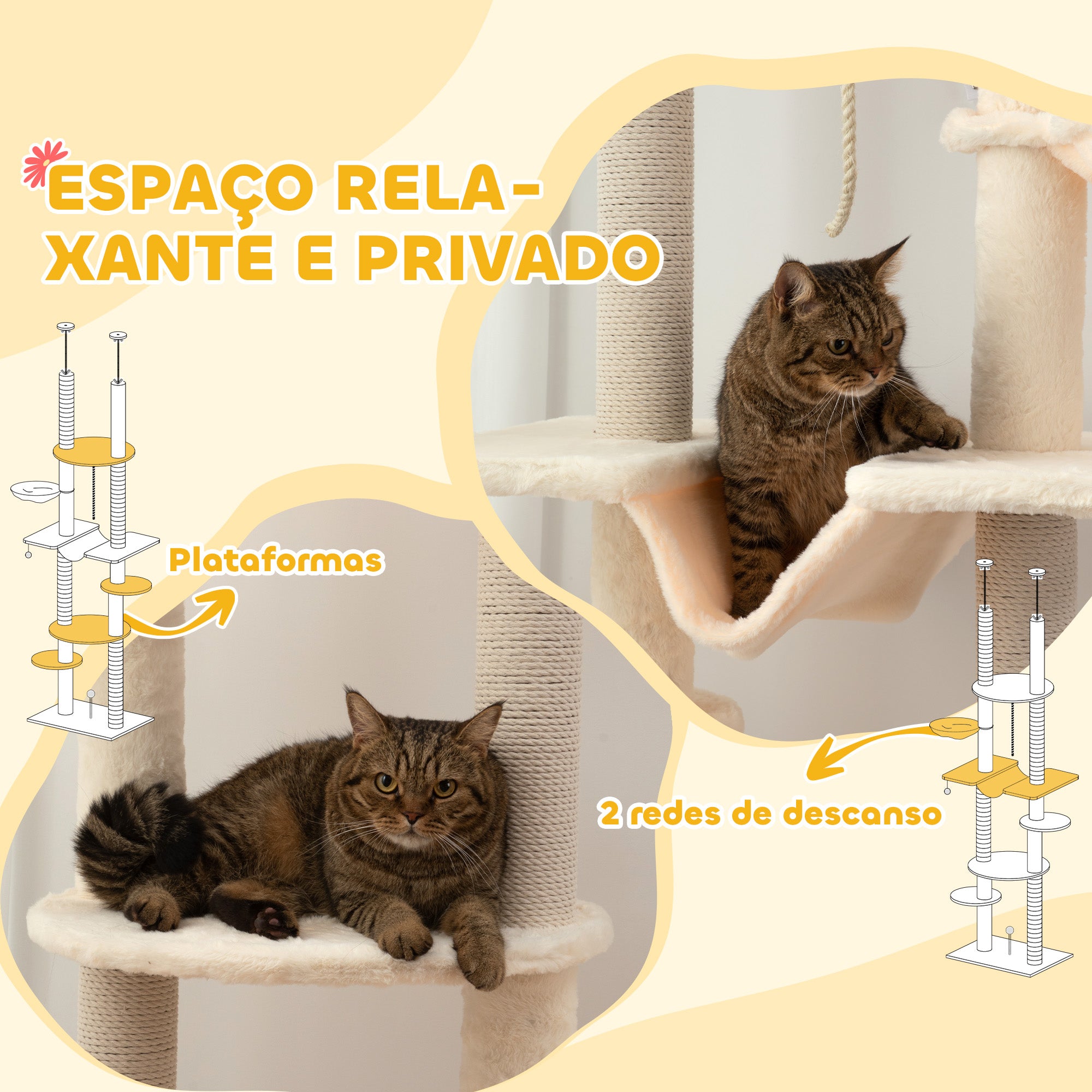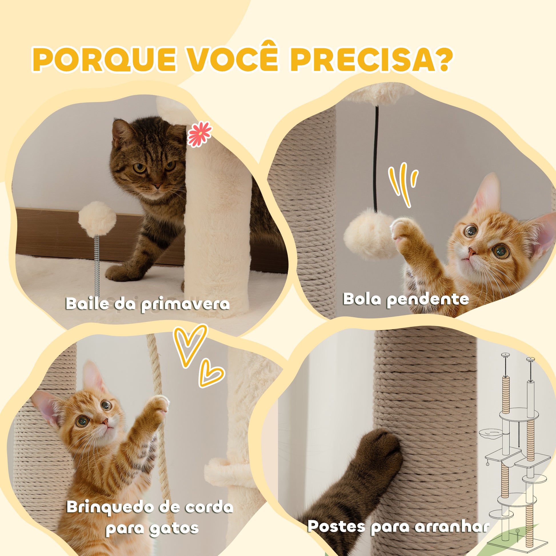 Este arranhador para gatos é o paraíso perfeito para os seus felinos, com múltiplas plataformas, postes de arranhar revestidos com corda de algodão, brinquedos suspensos e redes confortáveis.