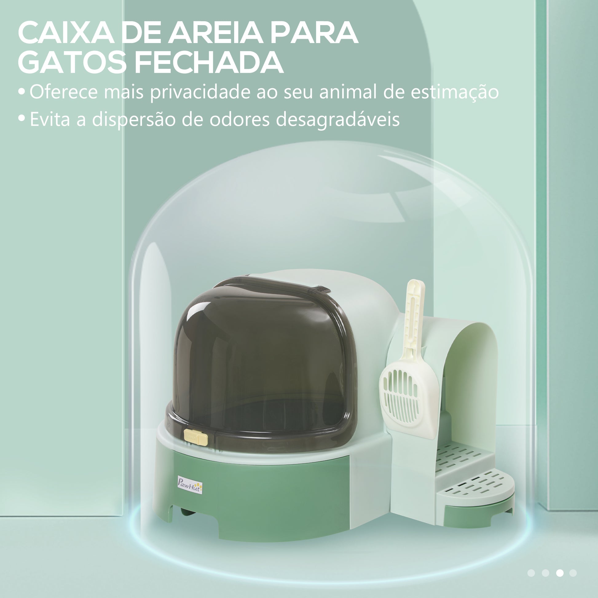 - Benefícios: Design original em forma de cápsula espacial, fácil acesso com porta lateral, privacidade para o gato, bandeja inferior amovível, fácil de limpar