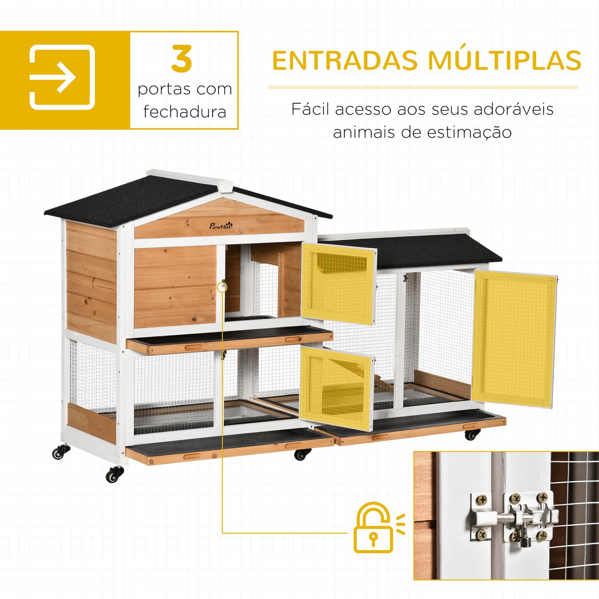 A coelheira inclui rodas para facilitar a movimentação, tornando-a móvel e prática. Com várias portas e rampa adicional, proporciona acesso fácil para os animais. A limpeza é simplificada com o tabuleiro deslizante integrado. Proporcione segurança e conforto ao seu animal de estimação com esta coelheira de qualidade.