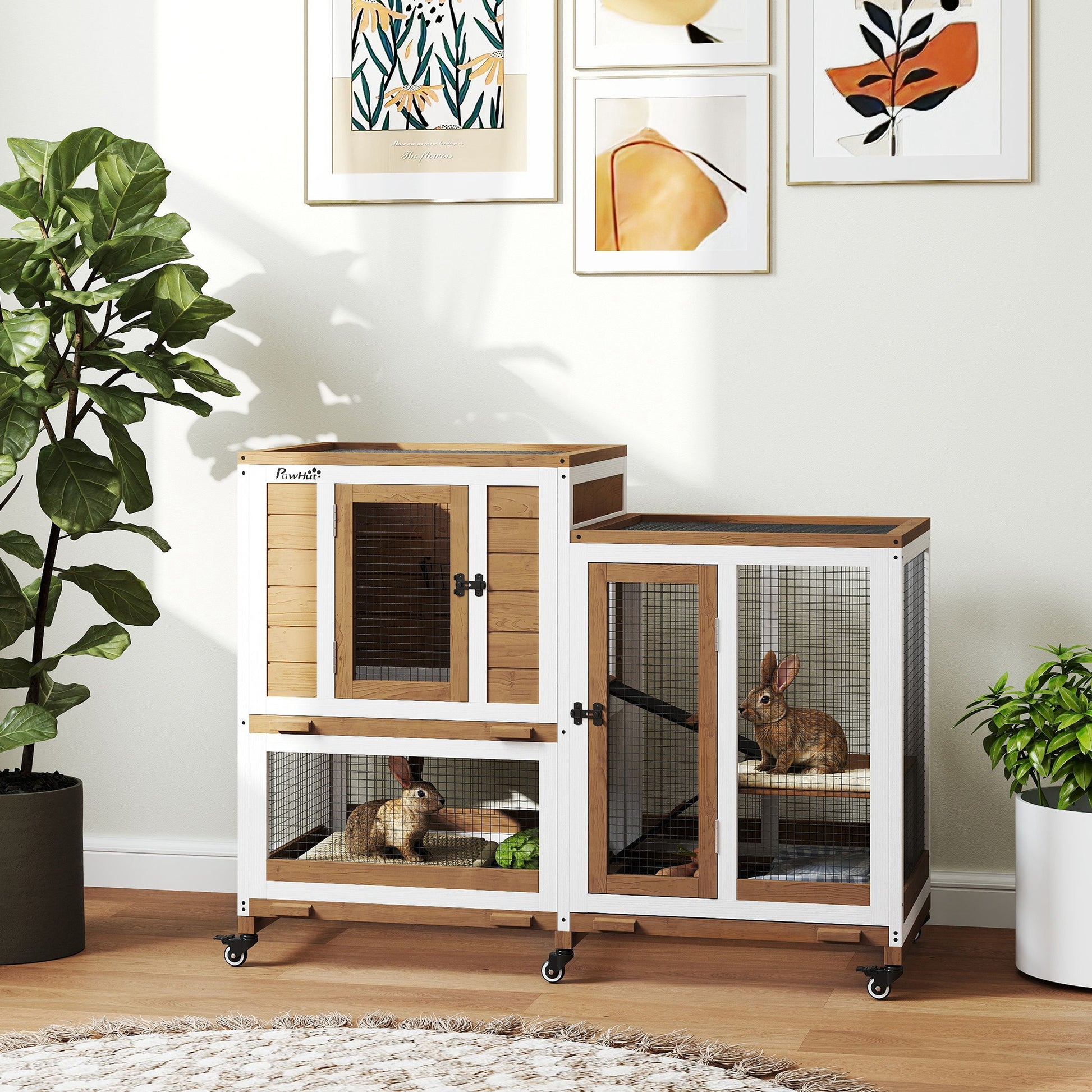 Proporcione um lar confortável para o seu amigo peludo com esta coelheira de madeira marrom de 2 níveis e 6 rodas.