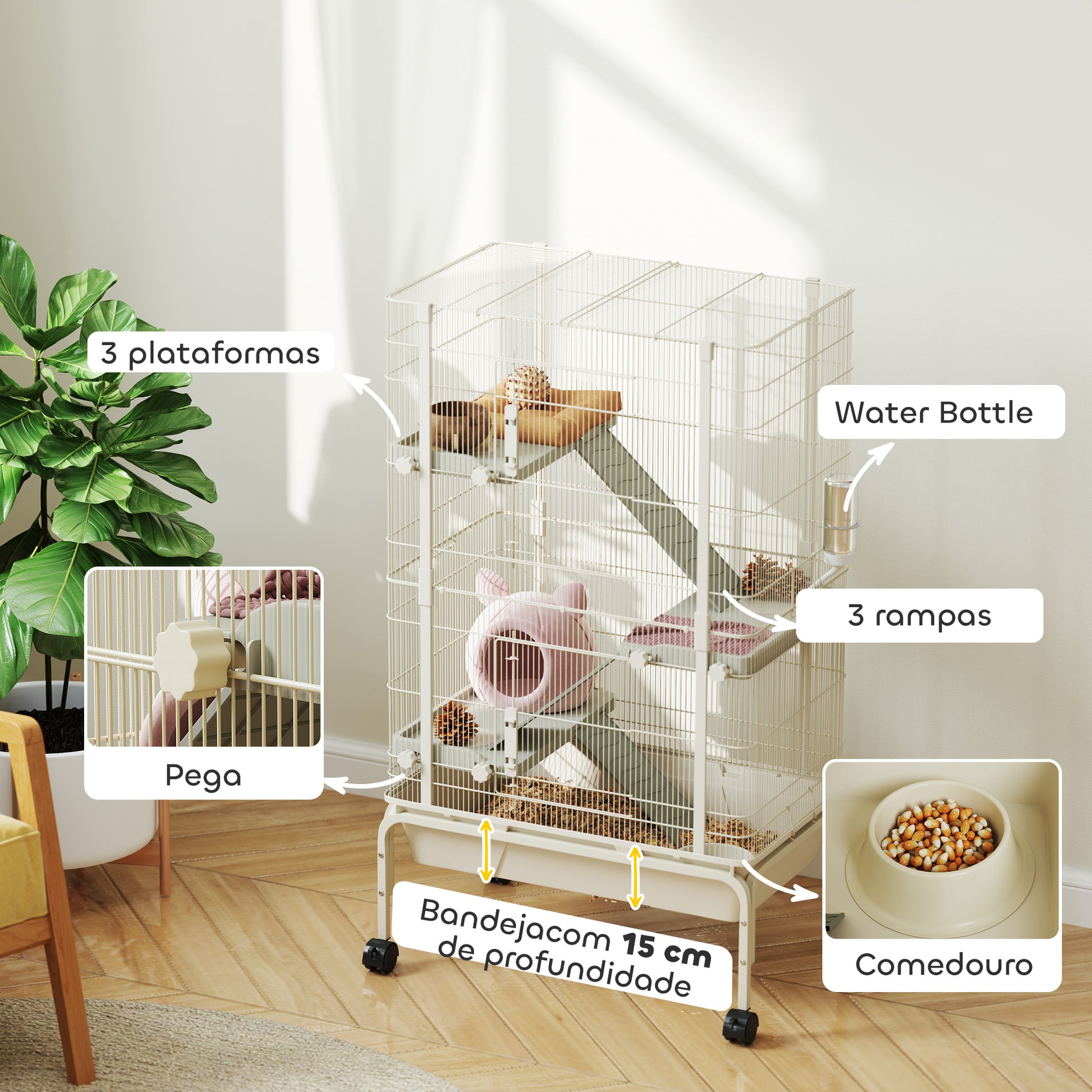 - Outras especificações: Rodas de 5,08 cm, espaçamento entre barras de 1 cm e pacote inclui 1 gaiola, 3 rampas, 3 plataformas, 1 recipiente para comida, 1 bebedouro e manual de instruções