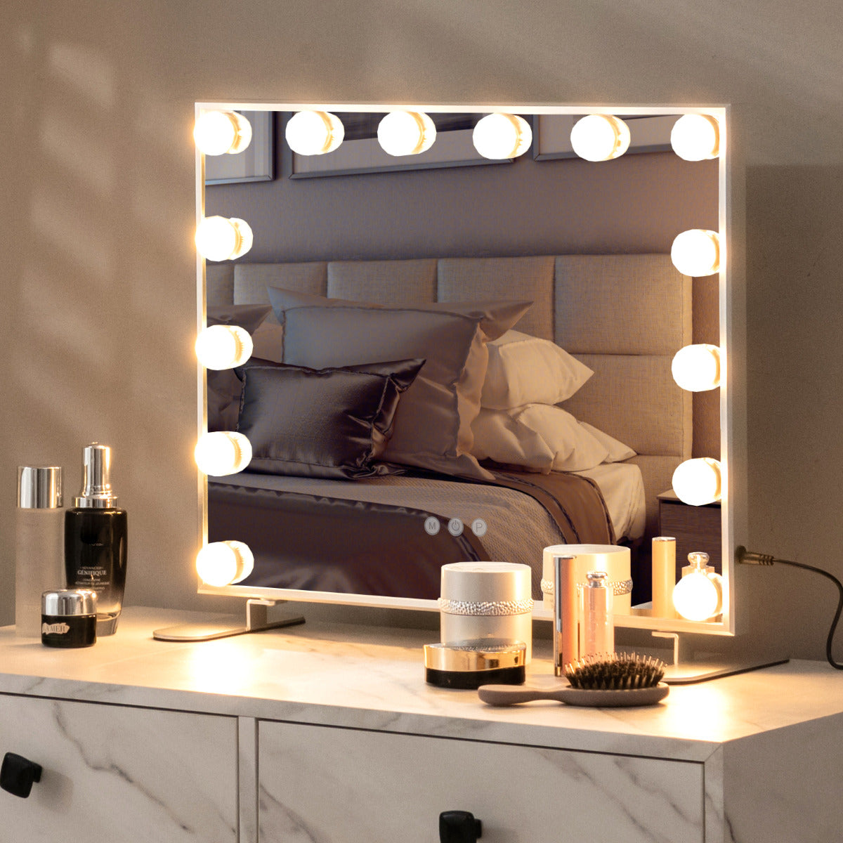 - Iluminação de 3 Cores e Brilho Ajustável: Este espelho de mesa está rodeado por 14 bombillas LED reguláveis, cujo brilho pode ser ajustado de 0% a 100% continuamente. Além disso, existem 3 modos de cor de iluminação para escolher: branco frio (6000K), branco quente (4200K) e amarelo quente (3200K).