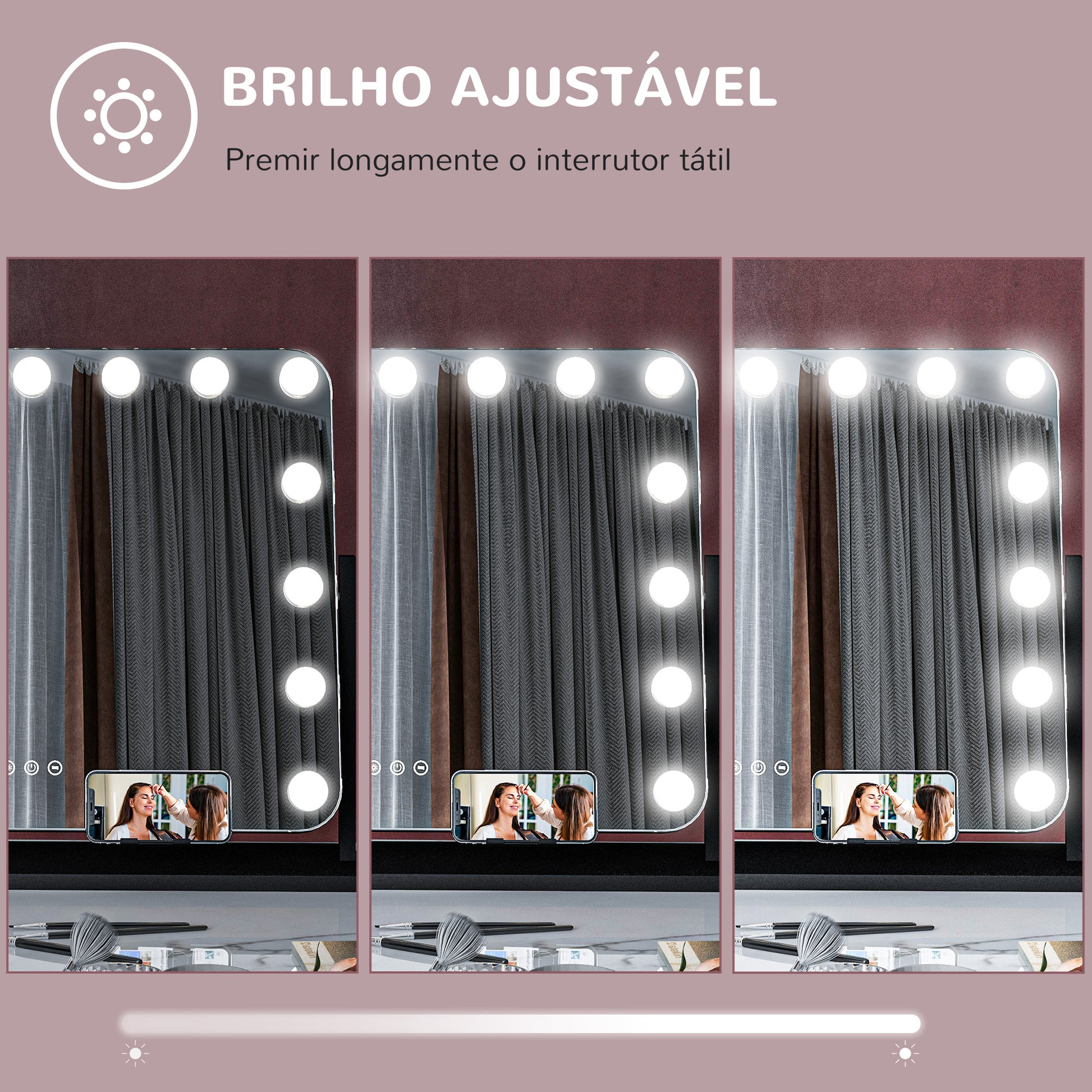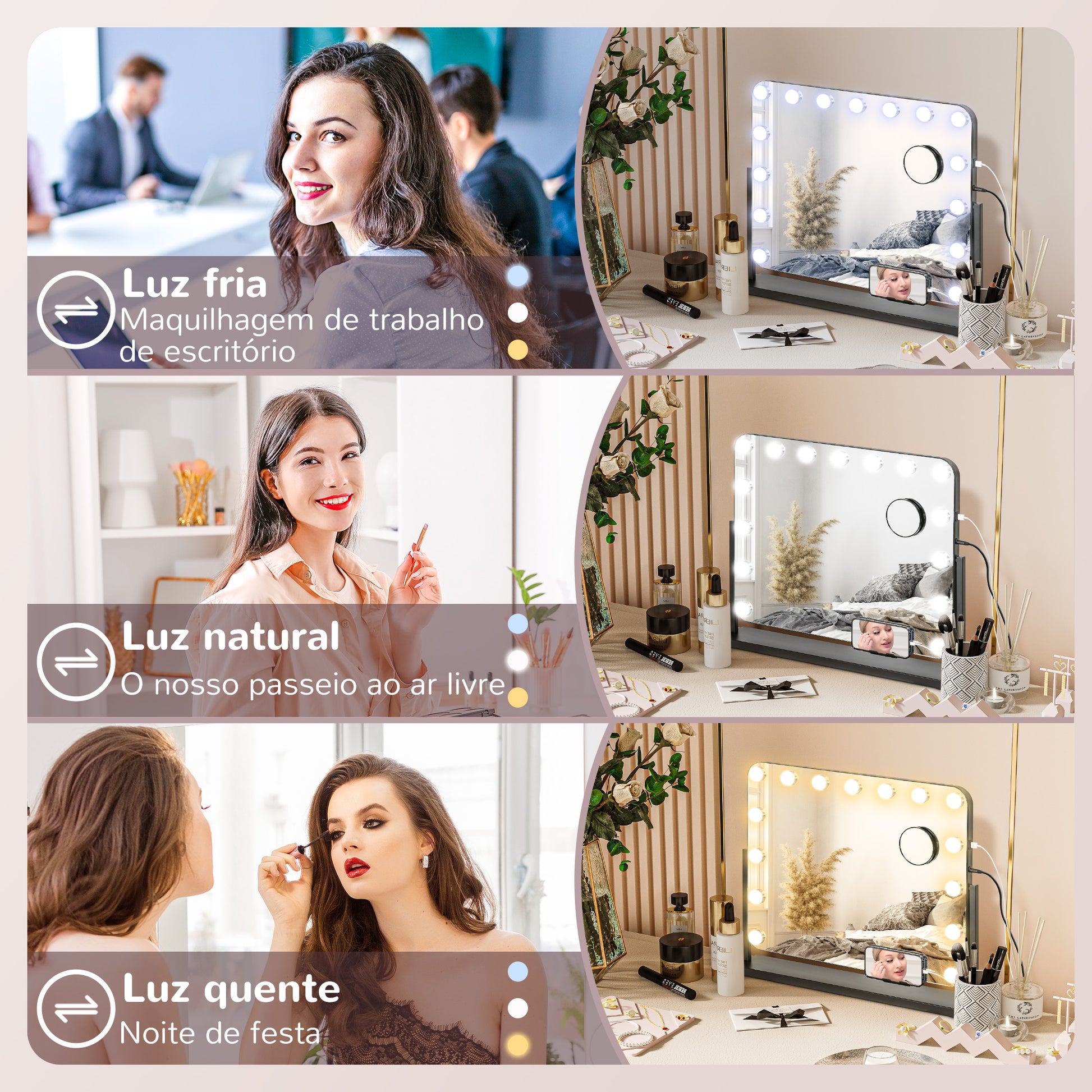 - Benefícios: Três modos de iluminação ajustáveis (quente, fria e natural), suporte para telemóvel, entrada USB, espelho de aumento 10x amovível