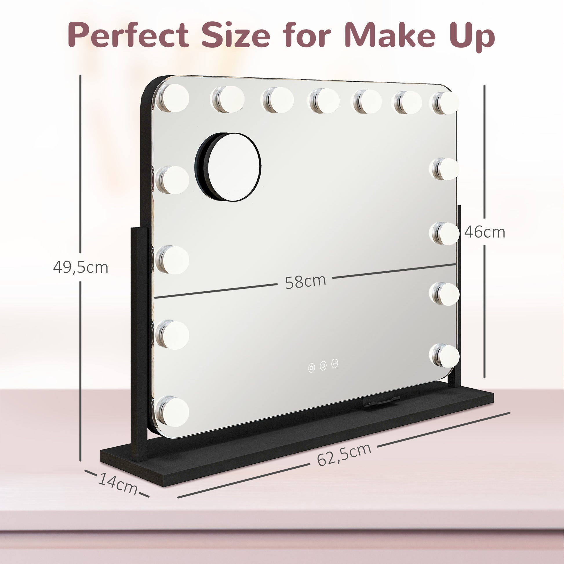 O nosso Espelho de Maquilhagem Estilo Hollywood é perfeito para criar looks incríveis. Com medidas de 58x46 cm e cor preta, este espelho proporciona uma visibilidade completa do rosto e uma iluminação perfeita graças às 14 lâmpadas LED incluídas.