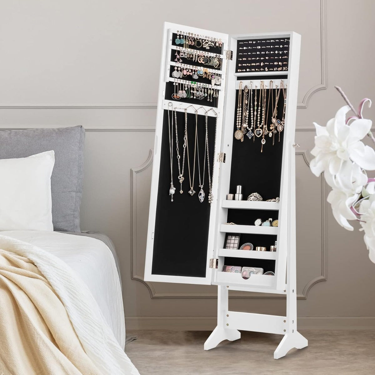 O nosso espelho joalheiro 2 em 1 oferece-lhe grande conveniência para a sua vida. Com 64 compartimentos para brincos, 44 furos para brincos, 20 ganchos para colares, 72 compartimentos para anéis e 4 prateleiras, pode facilmente organizar as suas joias e cosméticos. O batente magnético da porta mantém as suas joias seguras e protegidas do pó. O espelho de comprimento total ajustável em 3 posições oferece comodidade para se vestir.