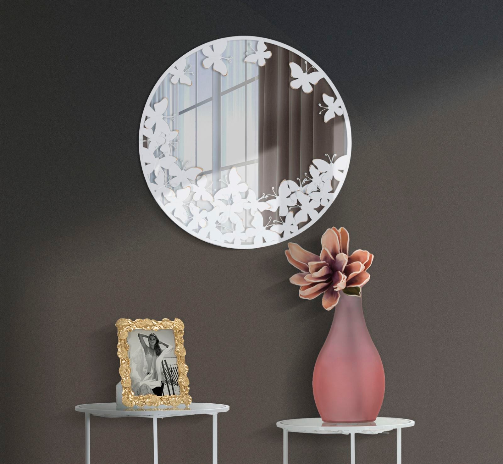 Transforme qualquer espaço com o requintado espelho redondo em metal GLAM, adornado com elegantes borboletas decorativas de perfis dourados. Este espelho, com a sua combinação sofisticada de cores branca e dourada, é o toque de glamour que faltava na sua decoração. Feito de ferro, MDF e espelho de alta qualidade, é um elemento essencial para dar brilho e ampliar visualmente qualquer ambiente. Descubra como a funcionalidade se alia ao design sofisticado para criar um ponto de luz distinto e cativante na sua casa.