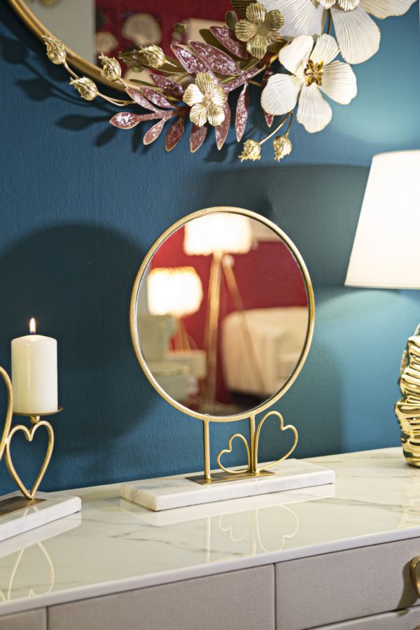 Descubra a elegância intemporal do espelho redondo GLAM, onde o luxo se encontra com o design sofisticado. Com uma moldura em metal dourado e uma base em mármore branco, este espelho destaca-se pela sua beleza e funcionalidade. Os corações elegantes acrescentam um toque romântico, tornando-o uma peça central perfeita para qualquer espaço moderno. Fabricado com materiais de alta qualidade como ferro, MDF, espelho e mármore, garante durabilidade e um acabamento premium. Transforme o seu ambiente com este espelho deslumbrante, ideal para quem aprecia o design e a qualidade em cada detalhe.