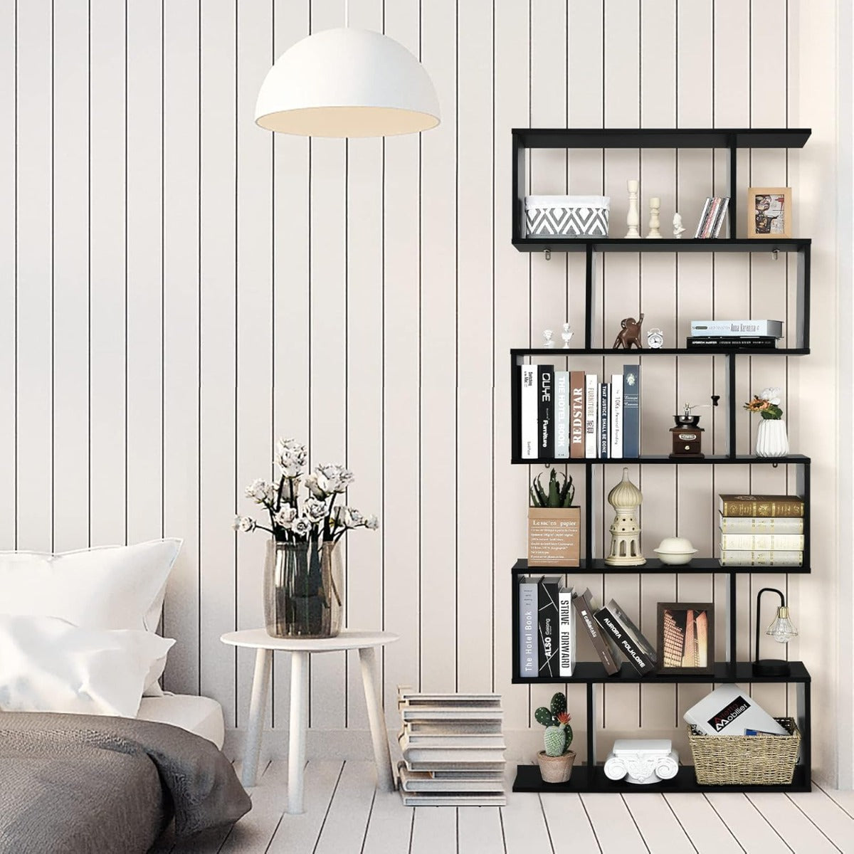 Procura uma estante moderna? Deverá considerar a nossa estante em forma de S, com um design elegante e sofisticado que se adequa a qualquer estilo de decoração, sendo a adição perfeita para a sala de estar, quarto e escritório. Com um total de 6 níveis, os prateleiras são espaçosas e permitem-lhe armazenar livros, álbuns de fotos e outros artigos. Fabricada com painéis laminados resistentes, cada nível suporta até 20 kg e a função antivuelco garante estabilidade.