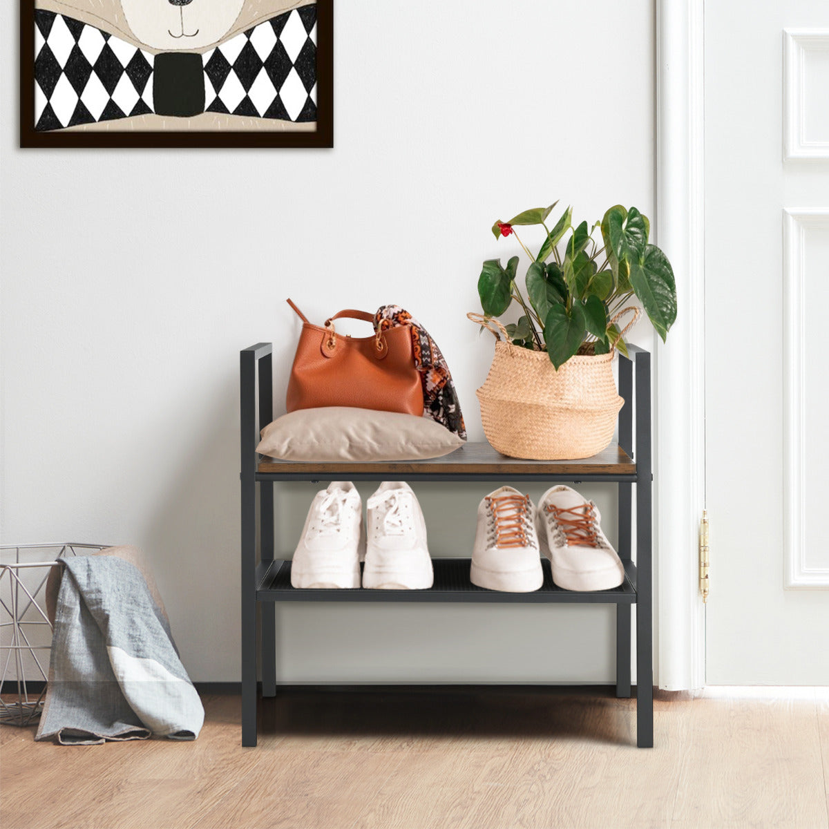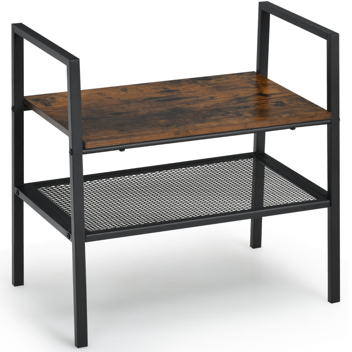 Procura uma solução de armazenamento compacta? A nossa estante é feita de madeira de engenharia de alta qualidade e aço revestido resistente, garantindo durabilidade e estabilidade a longo prazo. Com um design industrial clássico, integra-se perfeitamente em qualquer estilo de mobiliário. O amplo espaço de armazenamento inclui uma prateleira superior e inferior, oferecendo espaço suficiente para guardar presentes, livros, bugigangas, sapatos ou utensílios de cozinha. Pode ser utilizada como mesa de centro, estante de cozinha, sapateira ou mesa auxiliar.