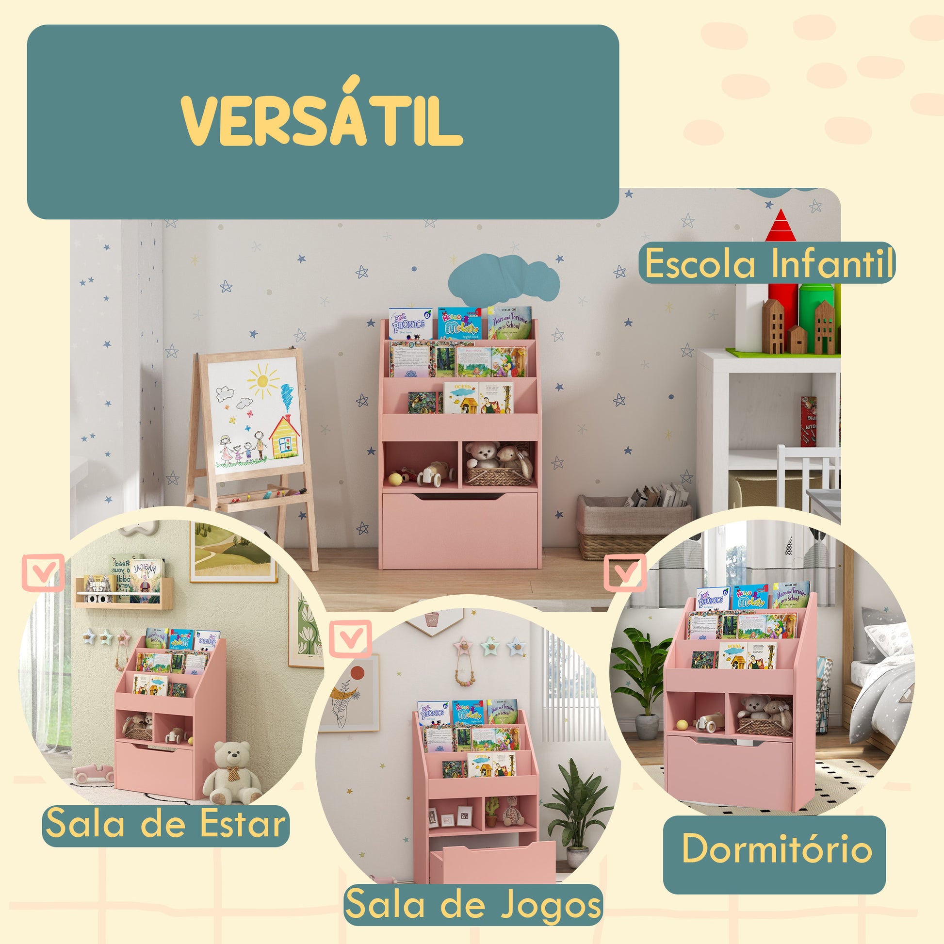 Estante de Madeira para Brinquedos com 3 Compartimentos 2 Prateleiras e Gaveta Móvel 60x29,9x90 cm - Rosa