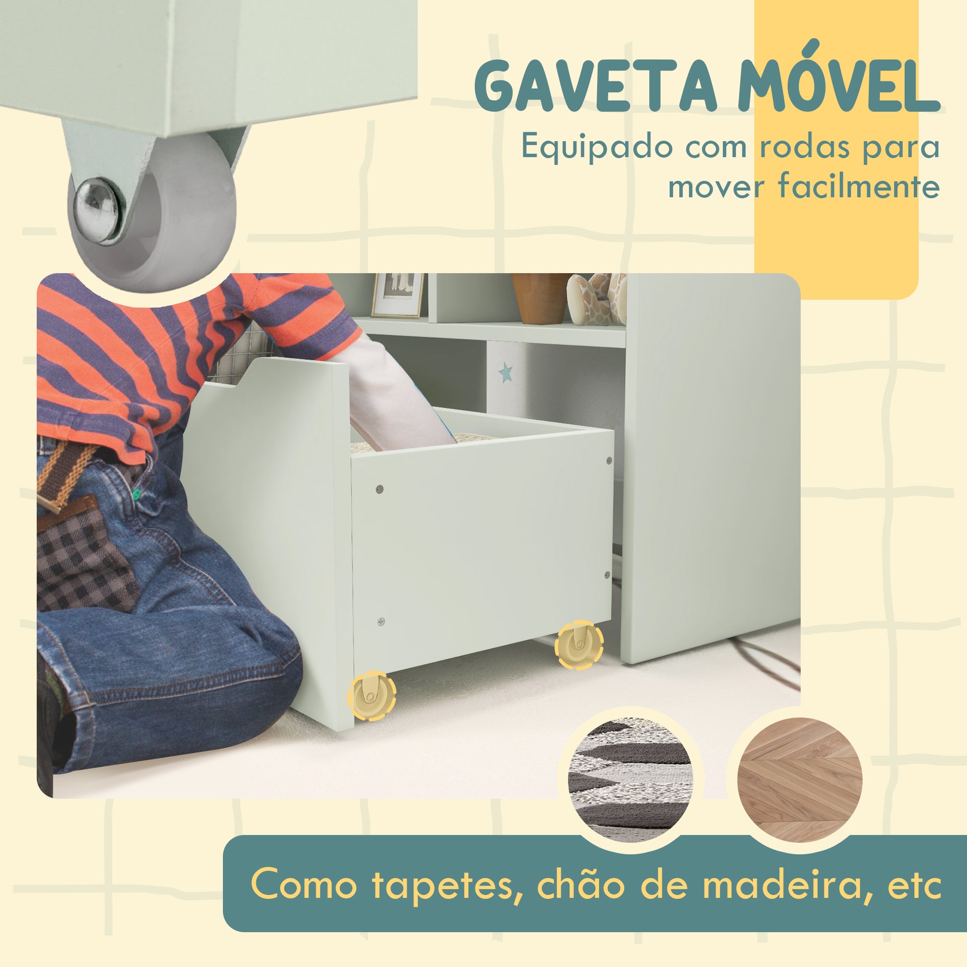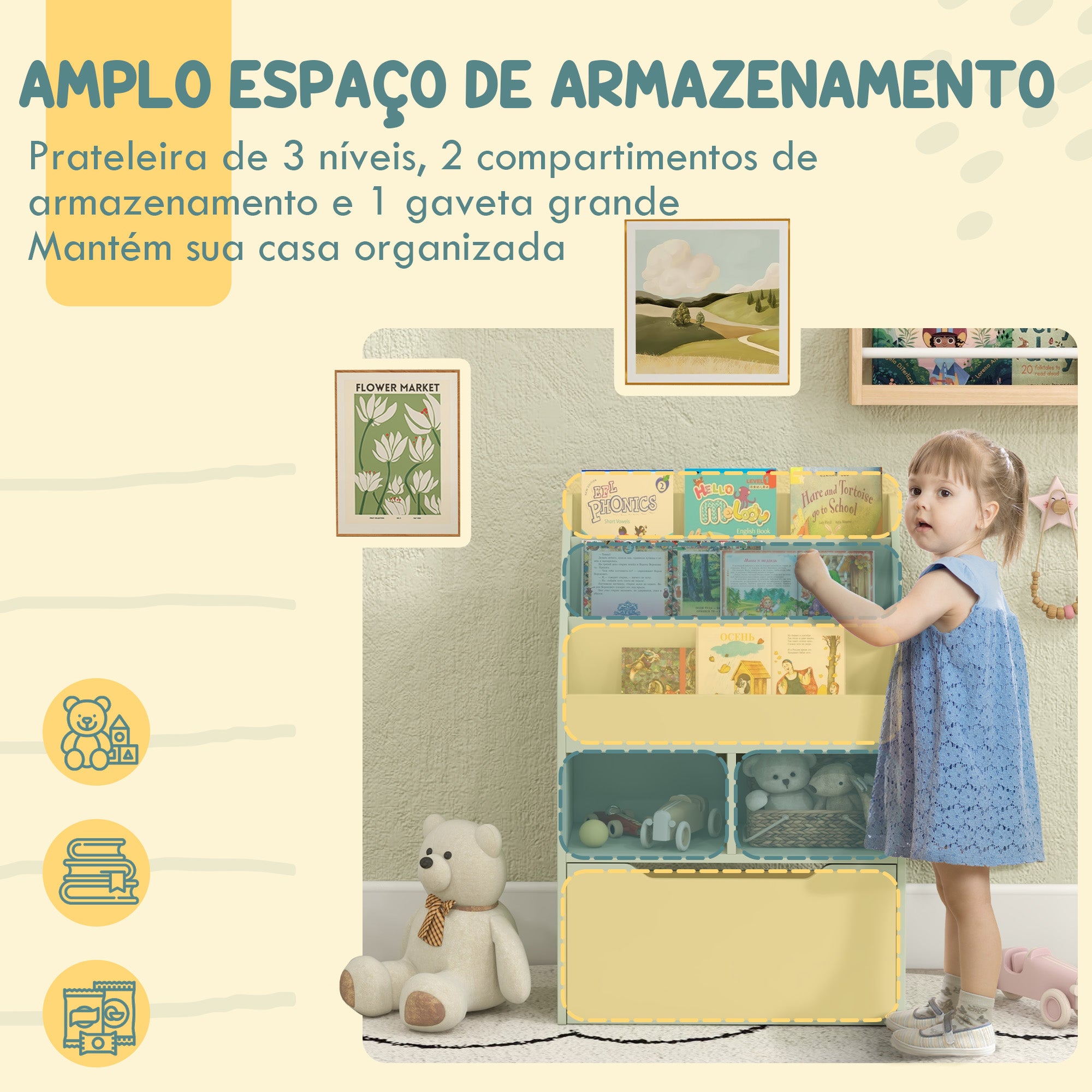 Estante multifuncional e decorativa perfeita para organizar brinquedos e livros em qualquer espaço da casa. Composto por 3 prateleiras para livros, 2 prateleiras abertas e uma ampla gaveta com rodas, oferece amplo espaço de armazenamento.