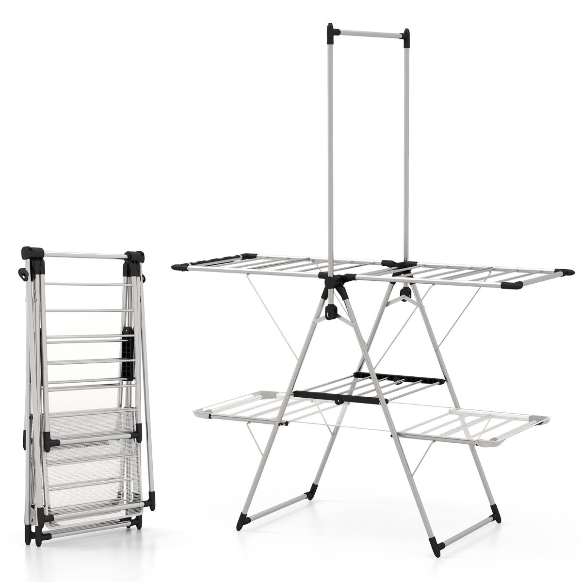 - Asa Ajustável: O suporte de secagem de roupa de 2 níveis inclui asas ajustáveis em altura para pendurar peças de diferentes comprimentos.