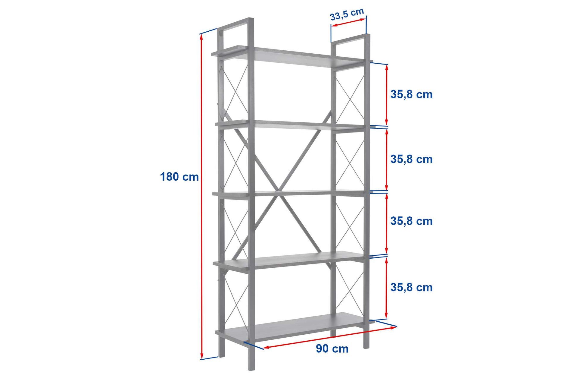 - Tamanho da estante: Largura: 90 cm, Altura: 180 cm, Profundidade: 33,5 cm