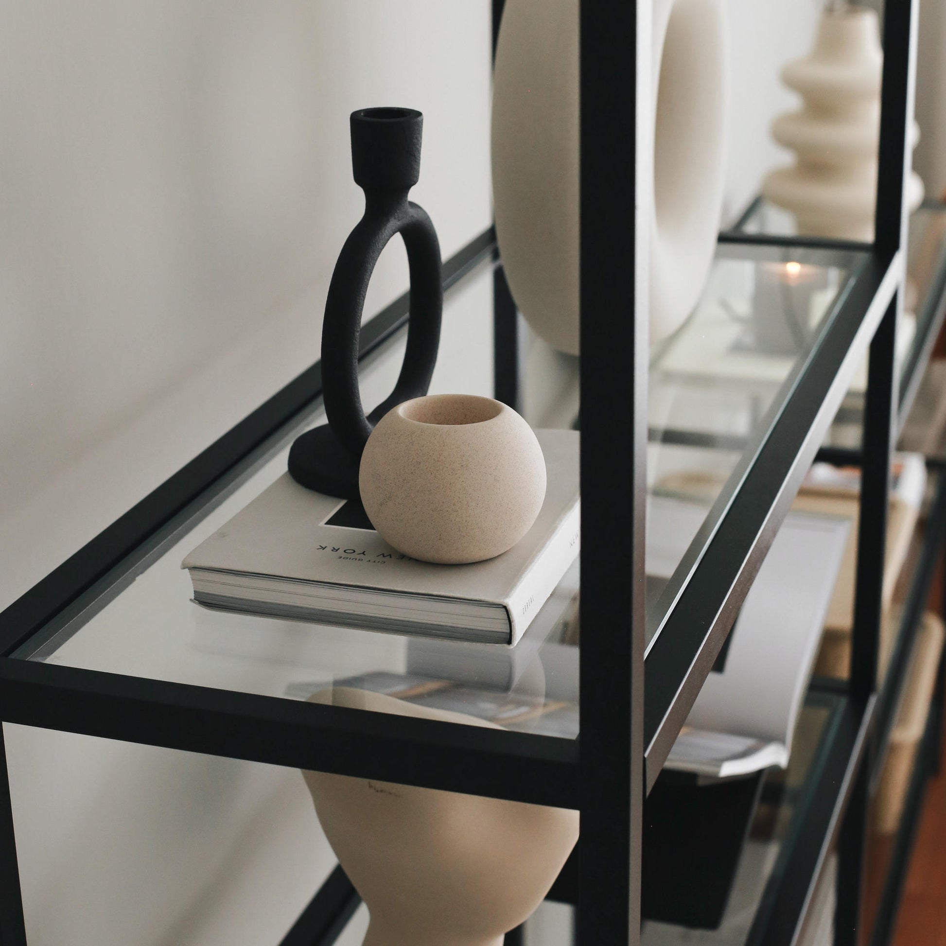Melhore o ambiente do seu espaço de vida com a nossa estante deslumbrante. Fabricada com vidro 100% temperado e uma estrutura metálica robusta, esta estante exala elegância e durabilidade. O seu design elegante e a cor preta dão um toque de modernidade e novidade a qualquer divisão.