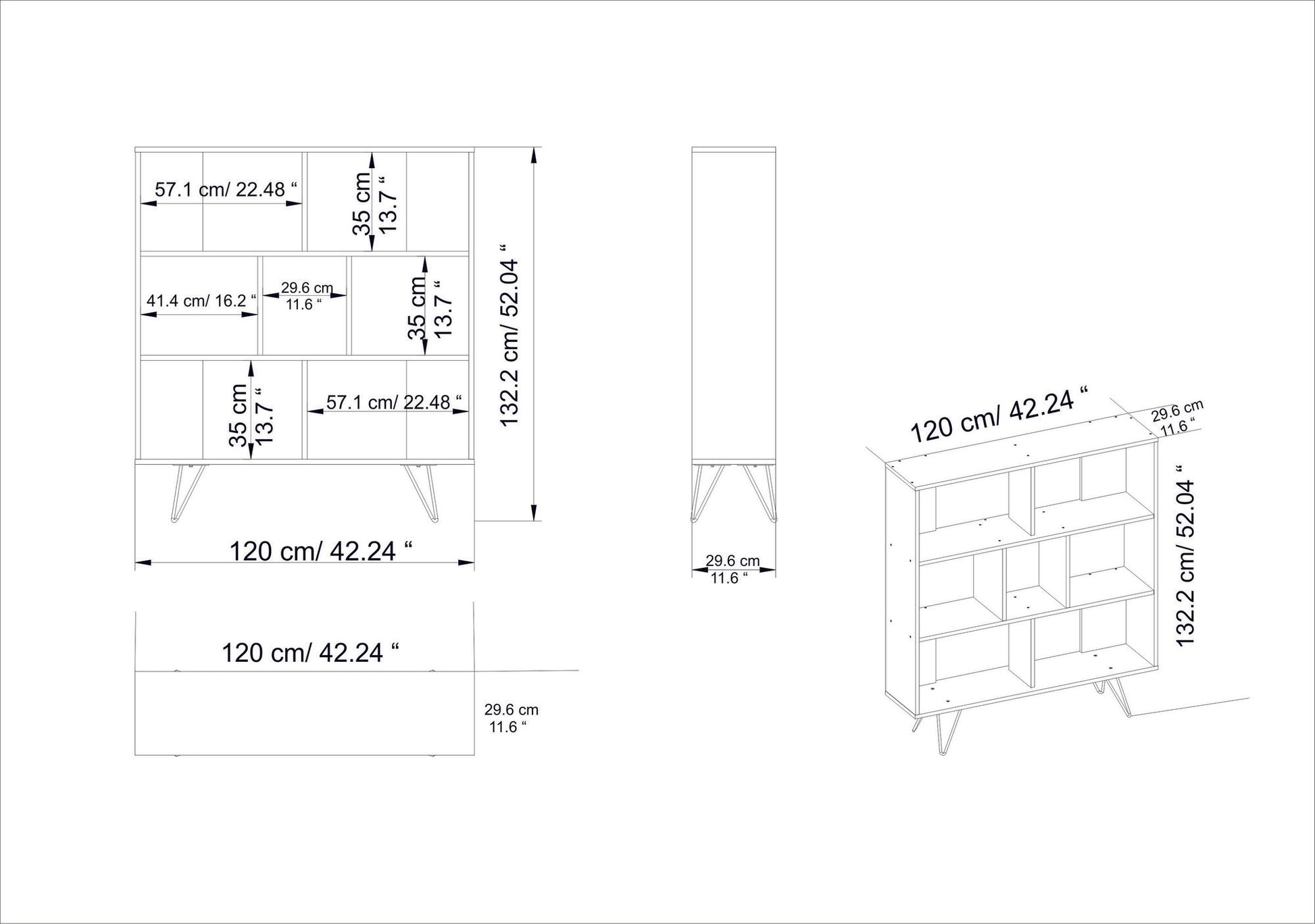 Com uma largura generosa de 120 cm e uma altura de 132. 2 cm, esta estante oferece muito espaço para mostrar os seus livros favoritos, objectos decorativos e recordações queridas. As numerosas prateleiras proporcionam uma organização prática, permitindo-lhe encontrar e expor facilmente os seus pertences.