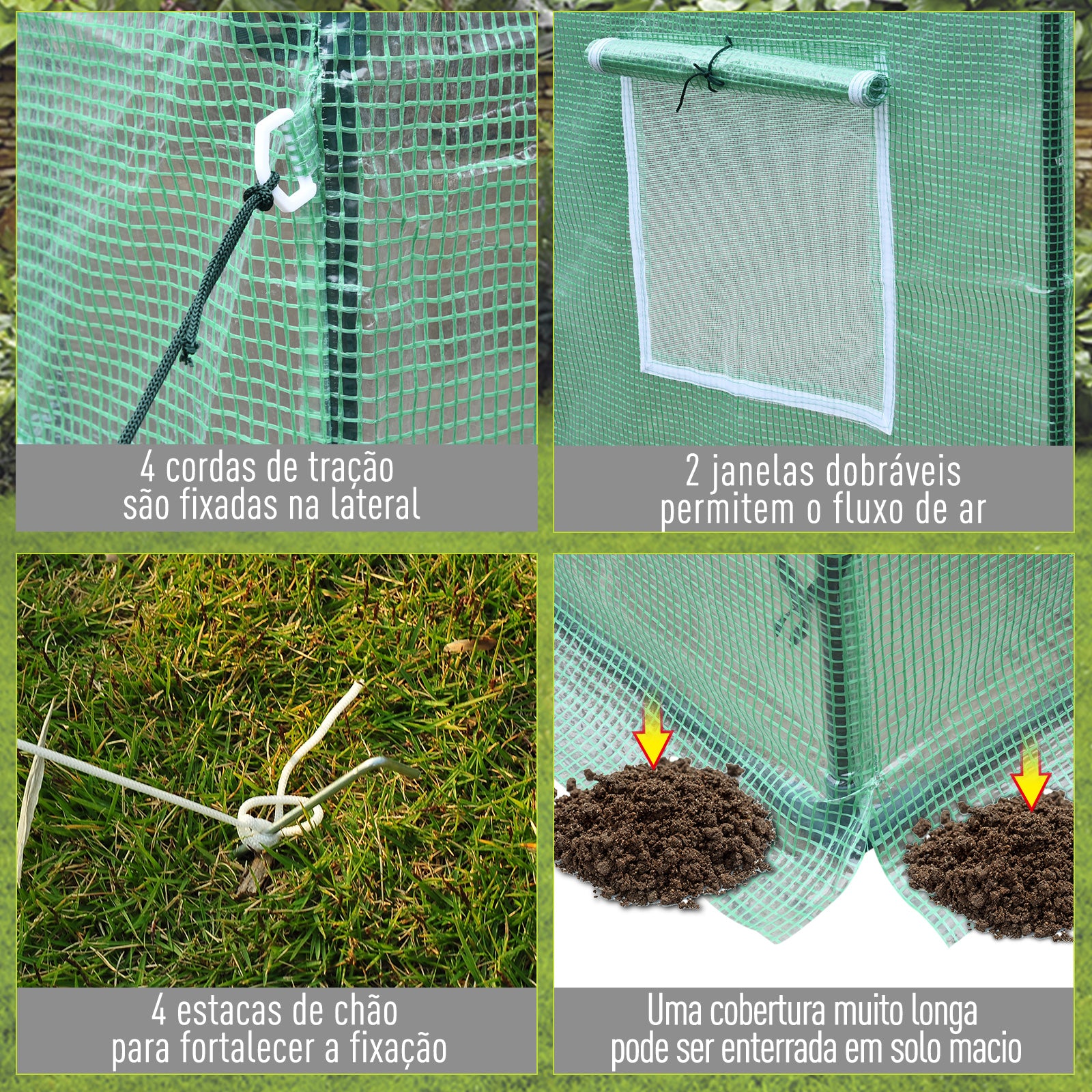 Estufa de Jardim Verde 200x73x168 cm com Tubos de Aço, 1 Porta e 2 Janelas Enroláveis