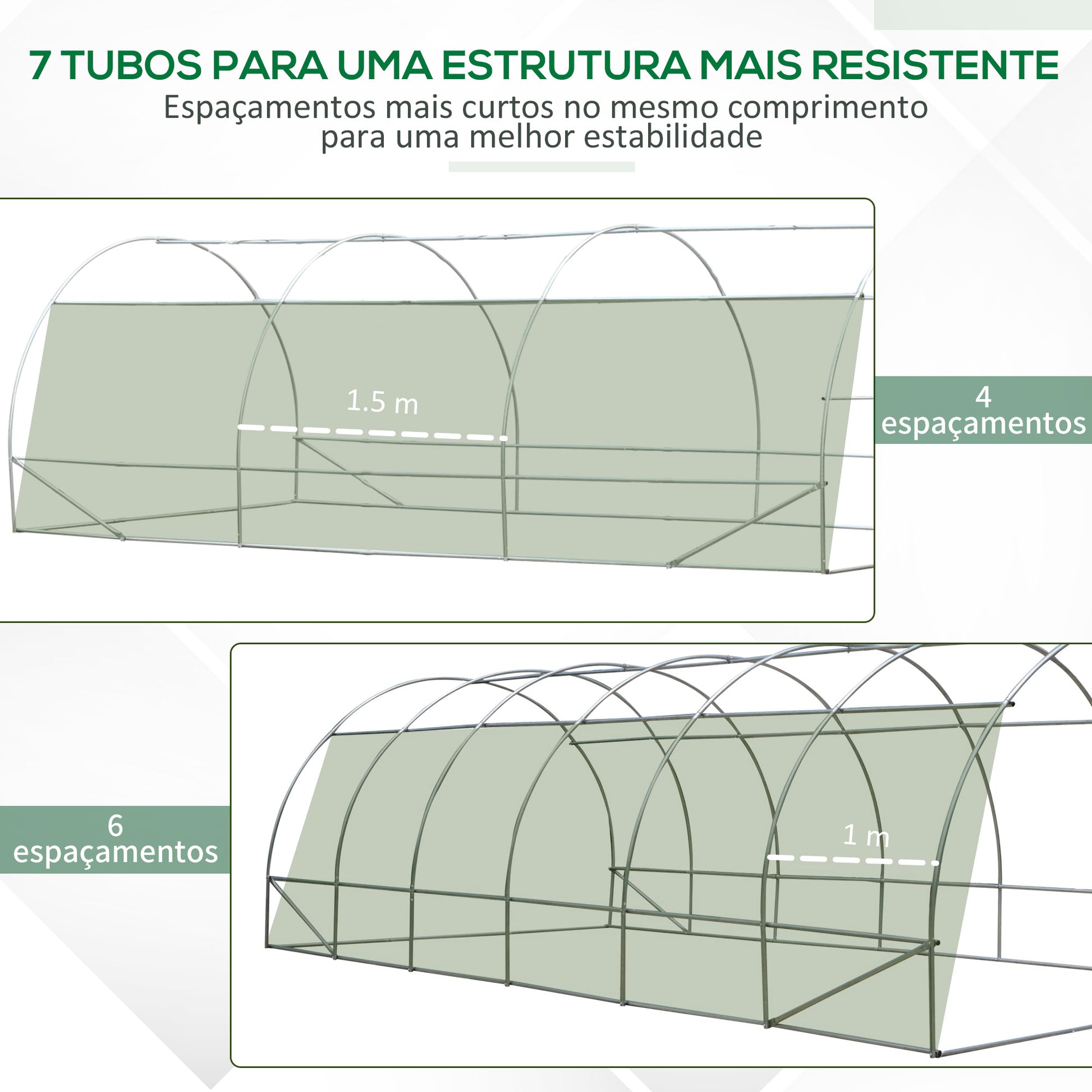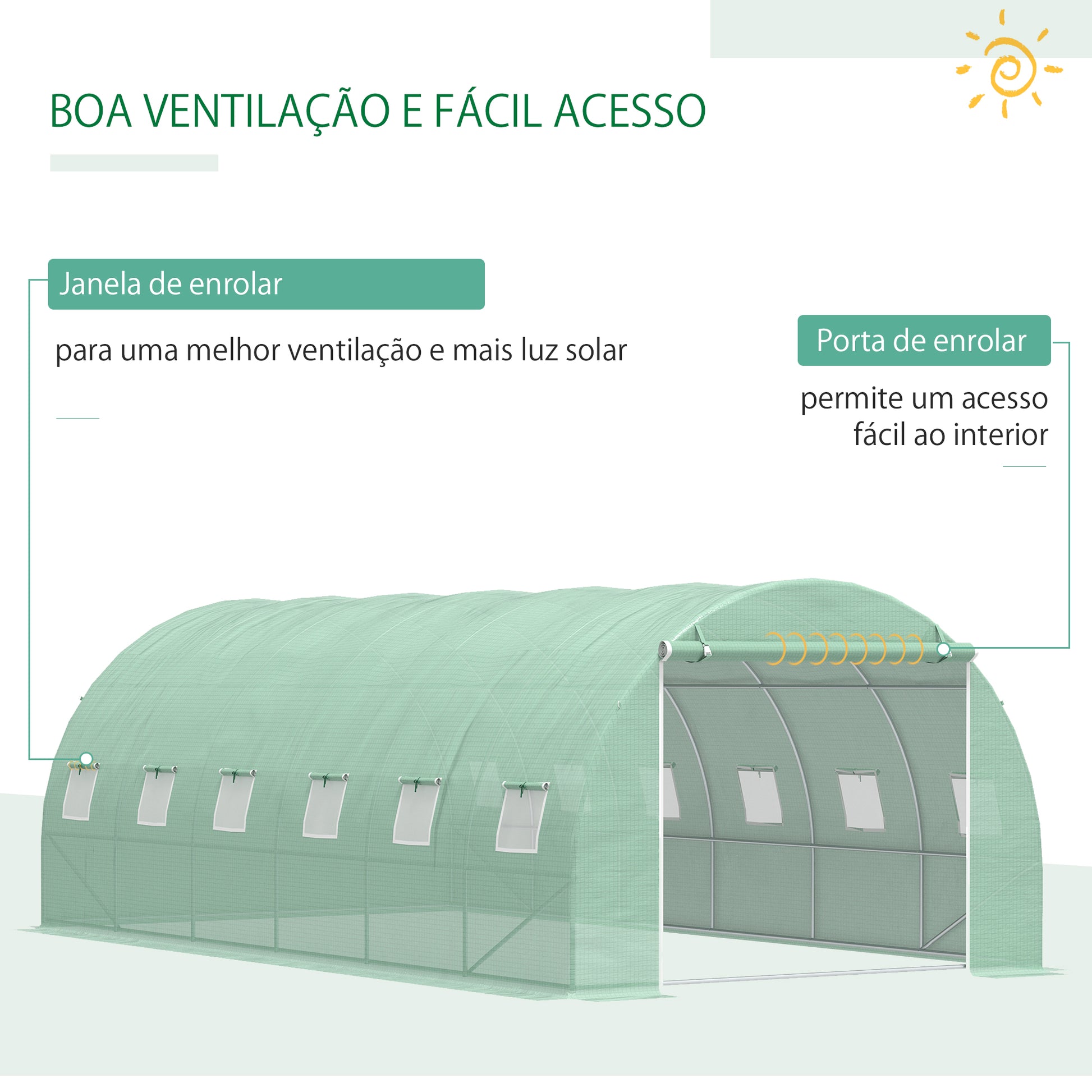 - Benefícios: Estrutura resistente e estável, cobertura de PE com proteção UV, porta de enrolar e 12 janelas com mosquiteira