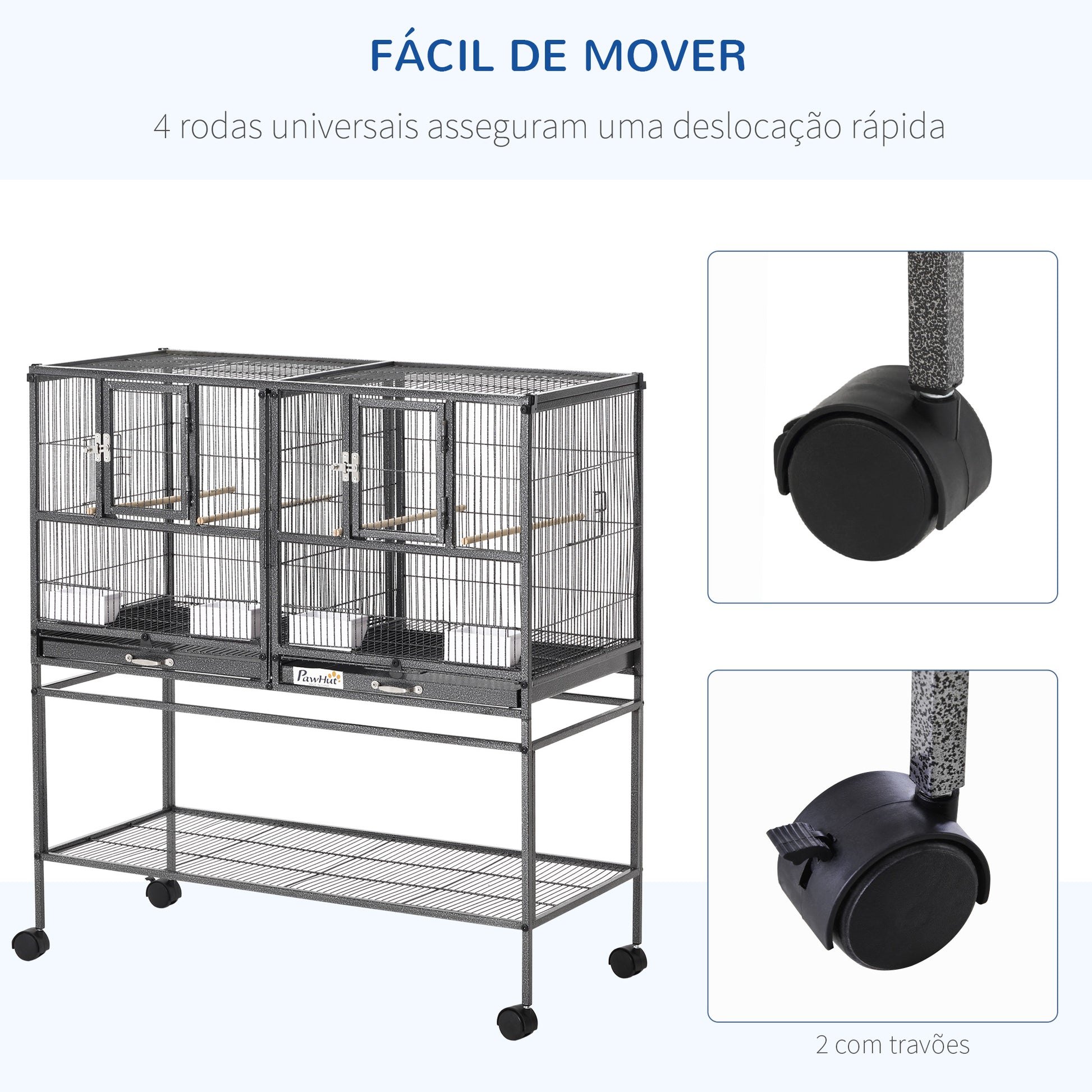 Mantenha seus pássaros ativos, seguros e felizes com esta gaiola dupla. Oferece espaço para atividades diárias e descanso seguro. Inclui 4 cabides de madeira e 4 alimentadores. As bandejas deslizantes facilitam a limpeza. As 4 rodas, 2 com freio, permitem movimentação fácil. Não hesite, compre agora!