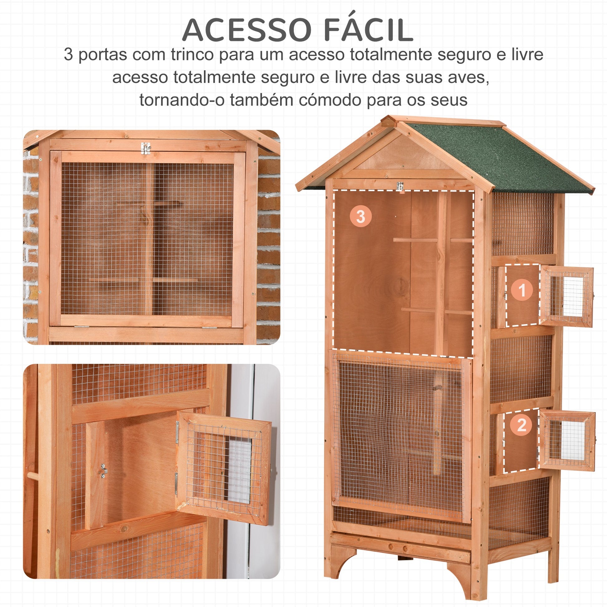 - Benefícios: Resistente às intempéries, fácil acesso através de portas frontais e laterais, 4 poleiros espaçosos para descanso, bandeja amovível para limpeza fácil.