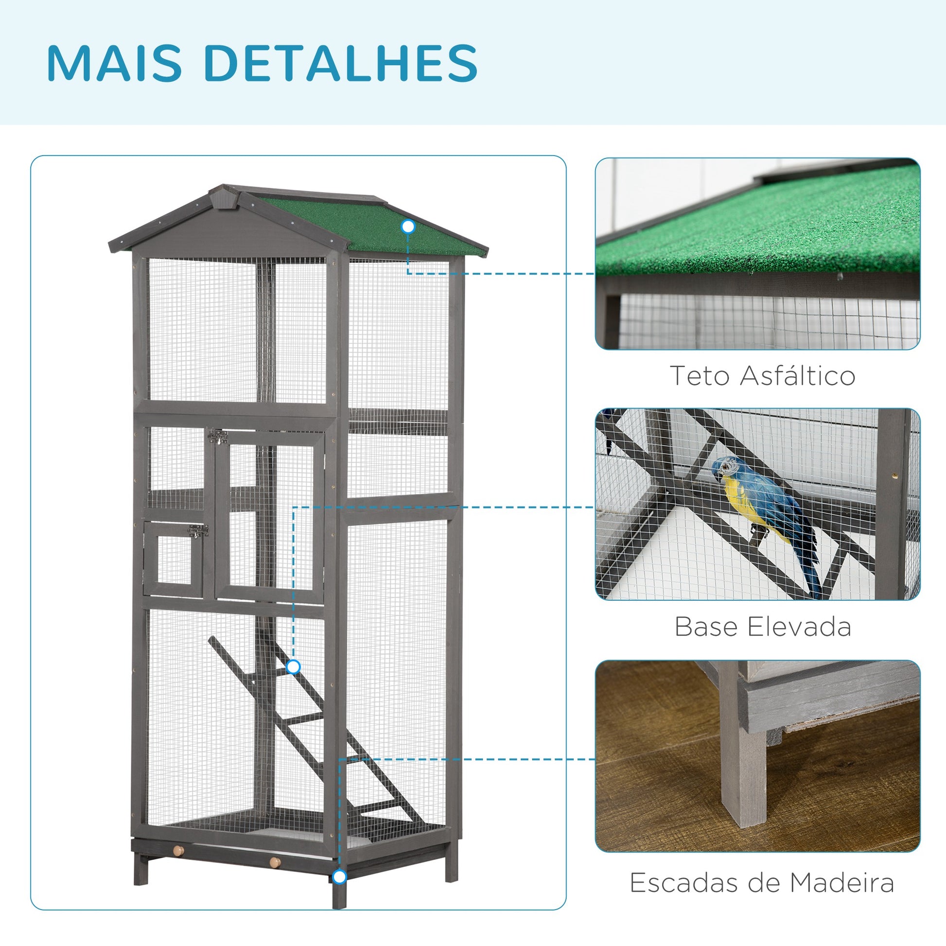 Proporcione aos seus amigos emplumados um espaço generoso para se movimentarem com conforto e esticarem as asas nesta gaiola para pássaros de madeira de abeto. Com medidas totais de 68x63x165 cm, esta gaiola cinzenta possui 2 portas para fácil acesso, bandeja amovível para facilitar a limpeza e teto asfáltico resistente.