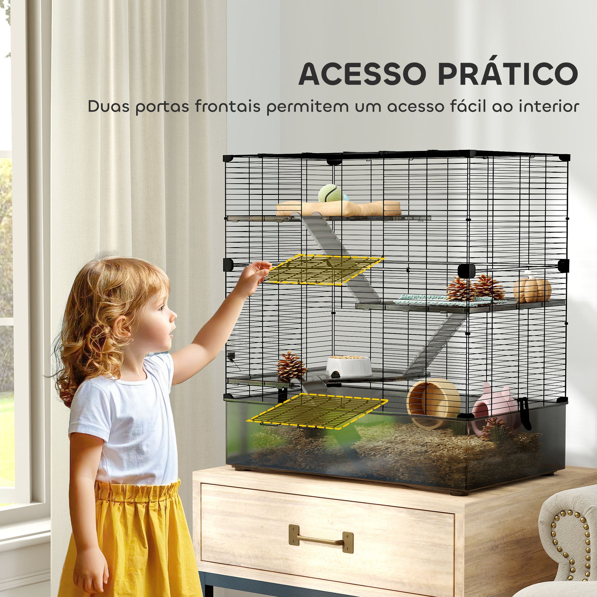 Proporcione conforto e segurança ao seu pequeno animal com esta gaiola de 4 níveis em preto. As medidas de 73x47x80 cm oferecem um amplo espaço para brincar e explorar.