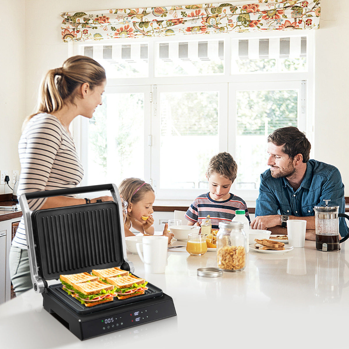 Grelhador Panini Elétrico 1800-2000W 3 em 1 Sanduicheira Abertura 180º Chapas Antiaderentes Controlo de Temperatura 35 x 30 x 14 cm Preto