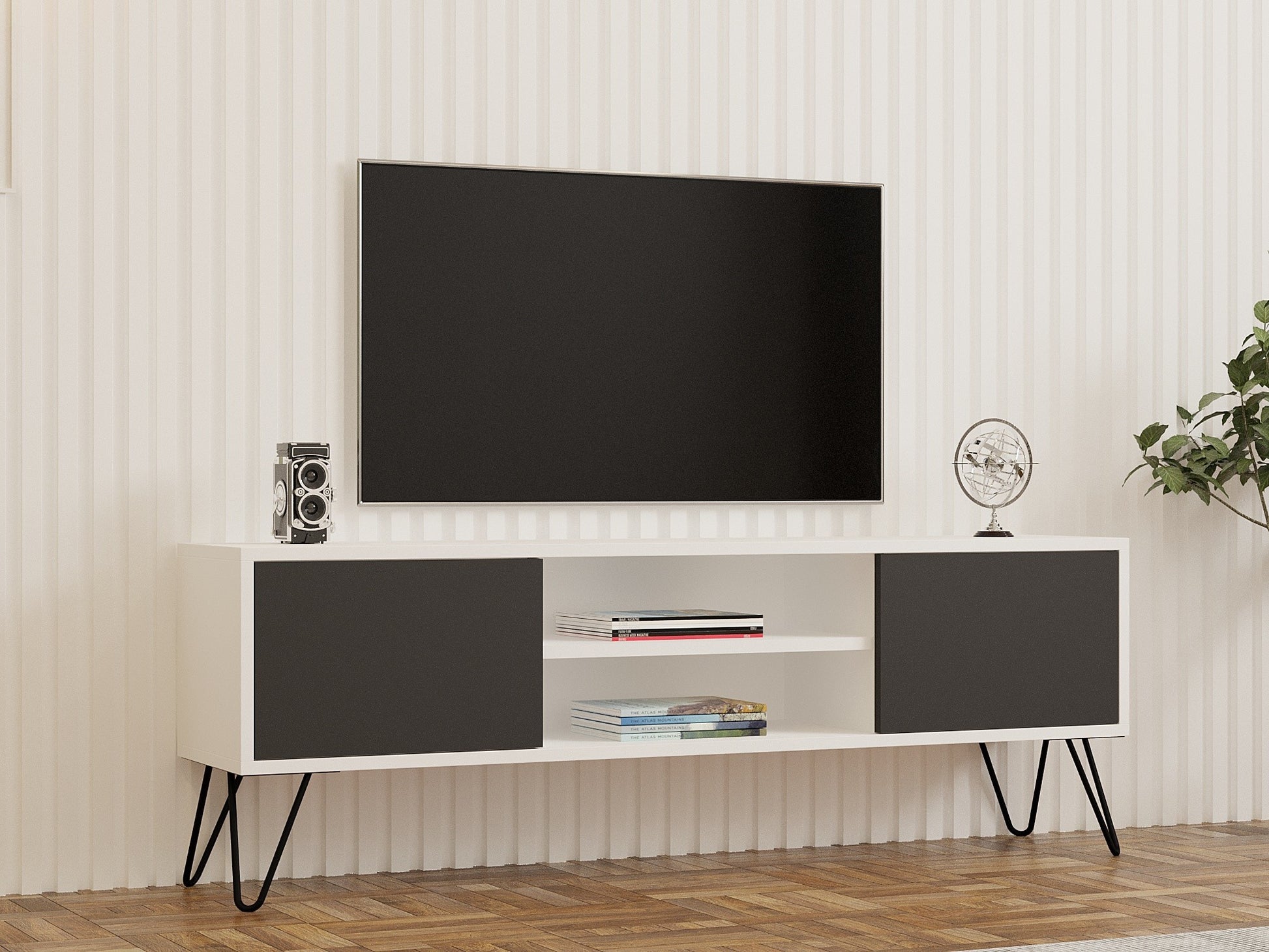 Fabricado com a máxima precisão e atenção aos pormenores, o nosso móvel para televisão apresenta um design elegante e moderno que complementará sem esforço qualquer decoração interior. A combinação das cores branco e antracite dá um toque de sofisticação, tornando-o num ponto de destaque no seu espaço de vida.