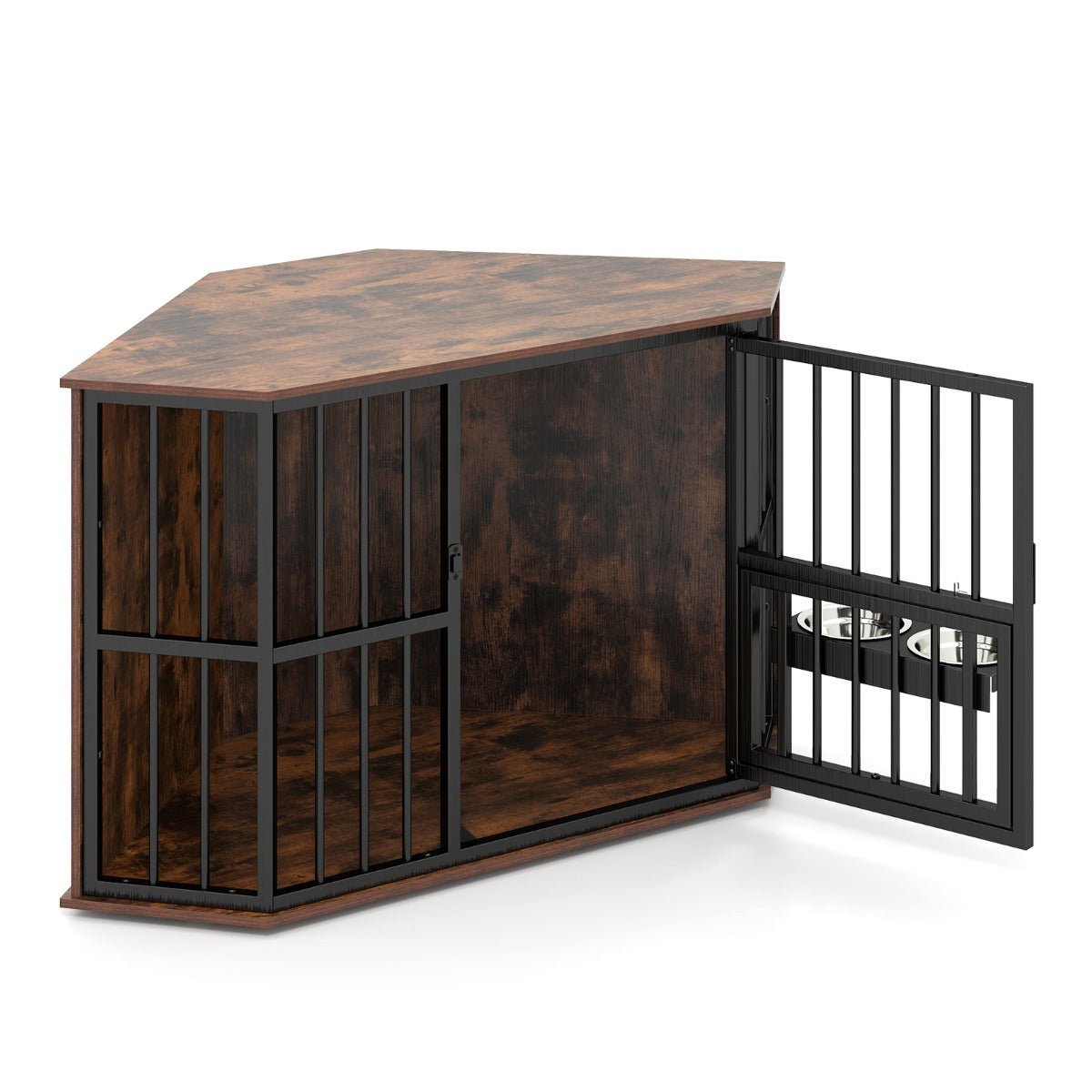 Jaula Esquinera para Cães com Comedouro Ajustável 2 Taças de Aço Inoxidável Porta com Fechadura e Pés Ajustáveis Castanho