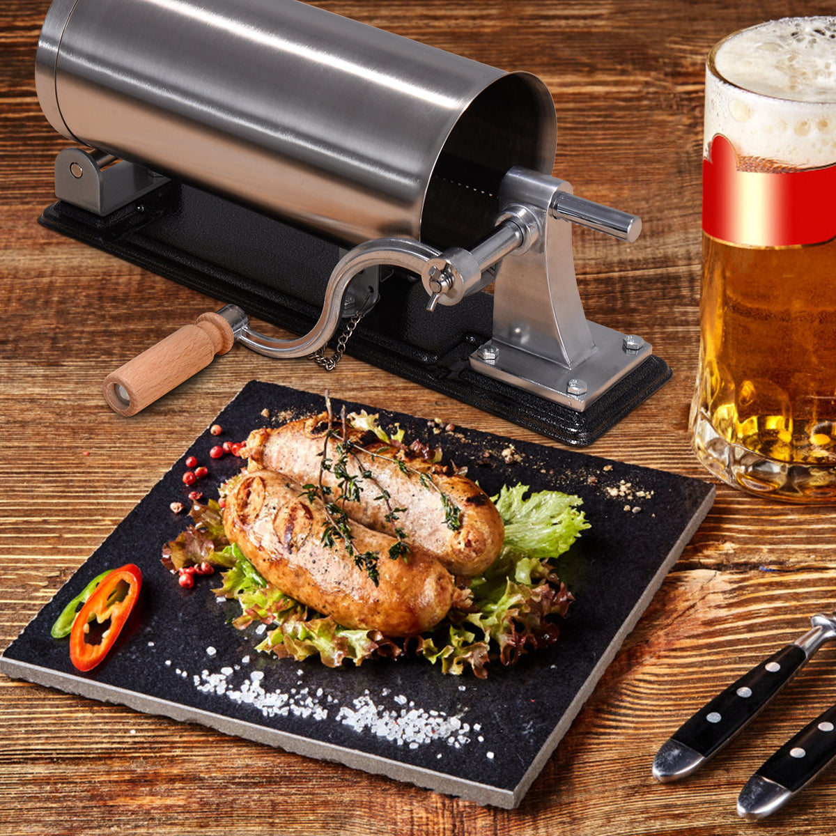 A nossa máquina de enchidos com design aerodinâmico é ideal para a produção de enchidos, cachorros quentes, chouriços, Kielbasa e muito mais! O cilindro em aço inoxidável com capacidade de 3kg é resistente à corrosão, à prova de água e garante anos de utilização. A manivela ergonómica permite uma produção estável, segura e de fácil funcionamento. A máquina de enchidos possui um suporte com braçadeira para fácil fixação em qualquer superfície plana. Vem com 4 tubos de enchimento de PP para produzir diferentes tamanhos de enchidos. Ideal para uso comercial, industrial, doméstico, etc.
