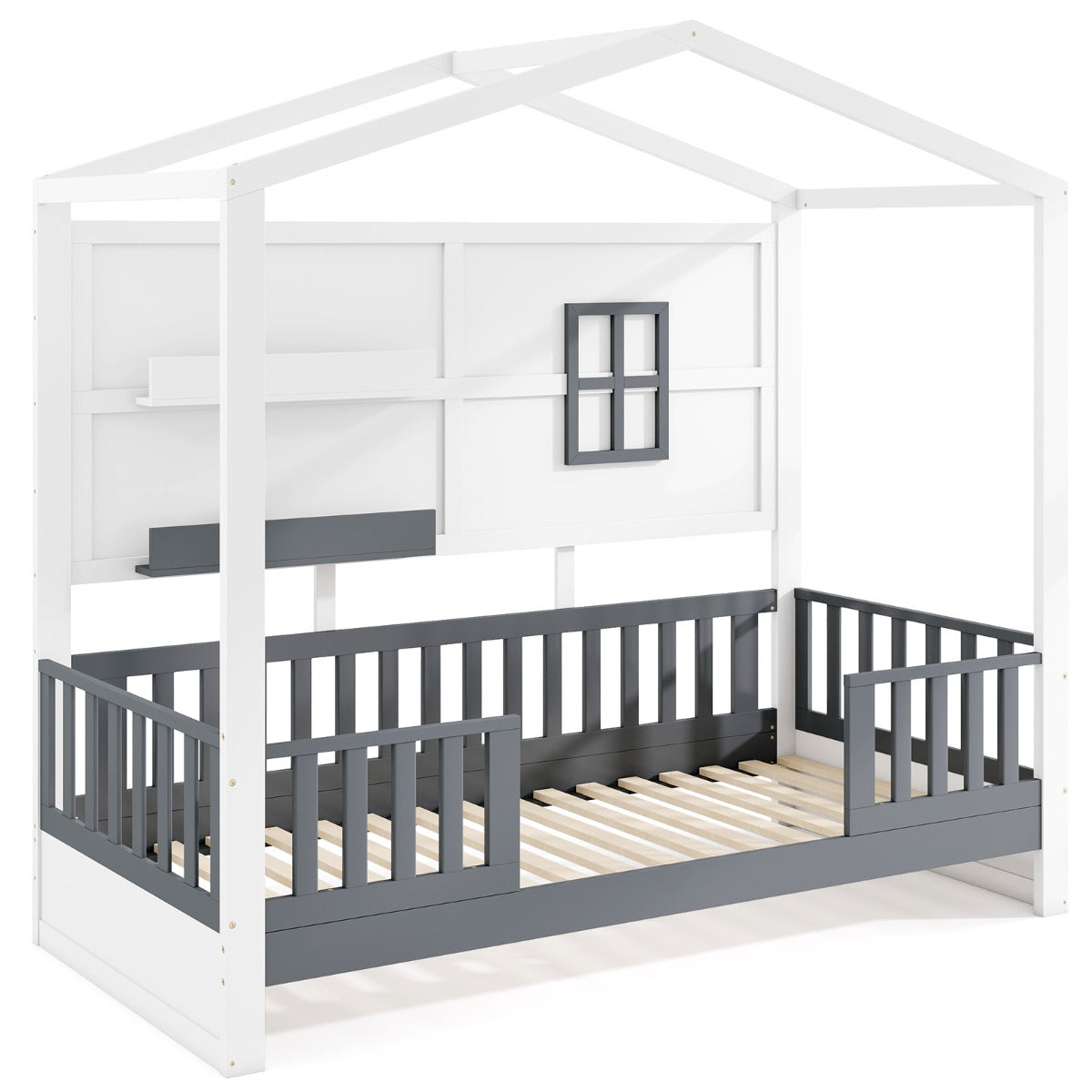 Marco de Cama de Madeira para Crianças com Estantes, Grade de Proteção, Janela e Cerca, Ripas de Madeira 206 x 97 x 192 cm Branco e Cinzento