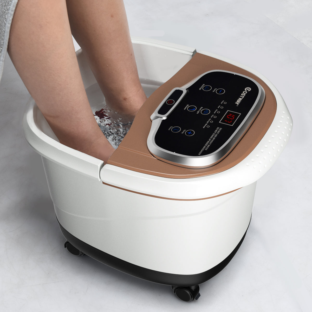 - Função duche e luz vermelha: a função duche tem 3 ângulos ajustáveis para relaxar as panturrilhas rígidas e doloridas e aliviar o cansaço. A luz vermelha desinfeta e esteriliza eficazmente. O compartimento é perfeito para colocar ervas ou sais marinhos para aumentar o efeito do massagem.