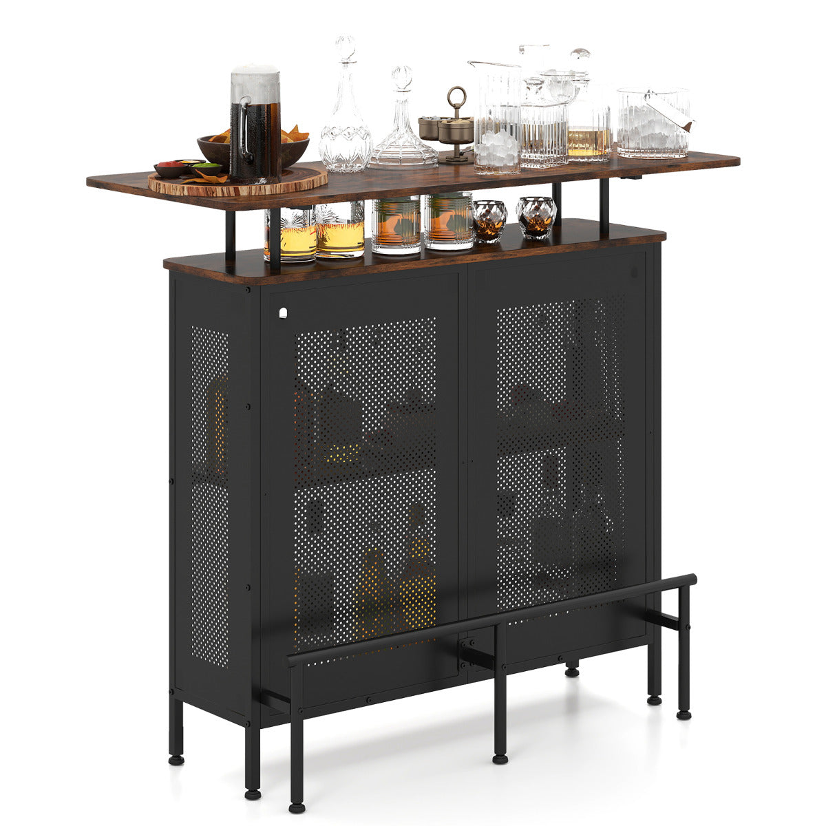 Mesa Alta de Bar Armário de Metal com 2 Estantes para Vinho e 6 Suportes para Copos Descanso de Pés para Bar Cozinha Pub 120 x 50 x 106,5 cm Castanho