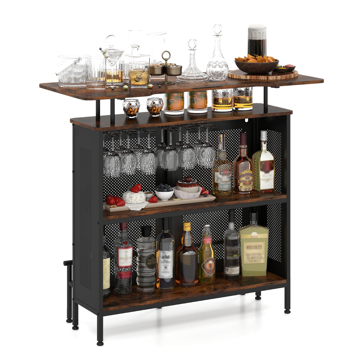 Características: Inclui 1 tampo, 1 prateleira aberta por baixo do tampo, 2 prateleiras e 6 suportes para copos para acomodar de 18 a 24 copos. Ideal para vinhos, copos, misturadores, acessórios de bar, balde de gelo, etc. Altura perfeita de 106,5 cm para conversas convenientes. Estrutura de metal perfurada que protege as garrafas de vinho. Descanso de pés de metal que ajuda os convidados a desfrutar das bebidas com conforto. Ideal para sala de estar, cozinha, pub, etc. Superfície fácil de limpar que lhe poupa tempo. Estrutura de metal sólida e pernas ajustáveis que garantem uma estabilidade geral.