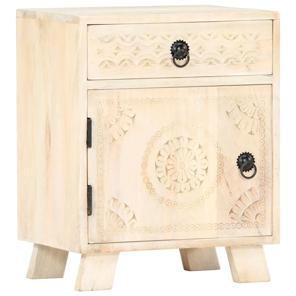 A mesa de cabeceira é feita de madeira de mangueira maciça, uma madeira de lei com grãos densos. A madeira de mangueira áspera não só possui força para suportar o peso, como também suporte o desgaste causado pelo tempo. Cada passo do processo é realizado com o maior cuidado, seja o polimento ou o envernizamento. A artesania requintada e o atrativo entalhe feito à mão tornam cada peça de mobiliário distinta e ligeiramente diferente das restantes. Equipada com 1 gaveta e 1 porta, esta mesa de cabeceira oferece um amplo espaço de arrumação para vários pequenos artigos. A nossa mesa de cabeceira já vem montada. Não requer montagem.