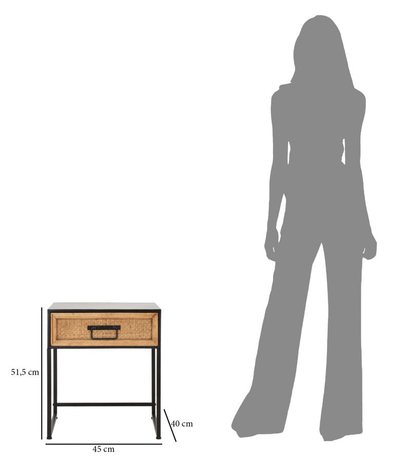 A mesa de cabeceira BOHO CHIC é a perfeita fusão entre modernidade e charme rústico. Com uma estrutura robusta em metal preto e uma gaveta em madeira que evoca a elegante trama do rattan, esta peça transforma qualquer espaço num ambiente sofisticado e acolhedor. O seu design simples e linear adapta-se harmoniosamente a qualquer estilo de decoração, tornando-a uma escolha versátil e intemporal. Fabricada em ferro e MDF, garante durabilidade e resistência, enquanto a sua estética multicolor adiciona um toque de personalidade ao seu quarto. Eleve o seu espaço com a combinação perfeita de funcionalidade e estilo.