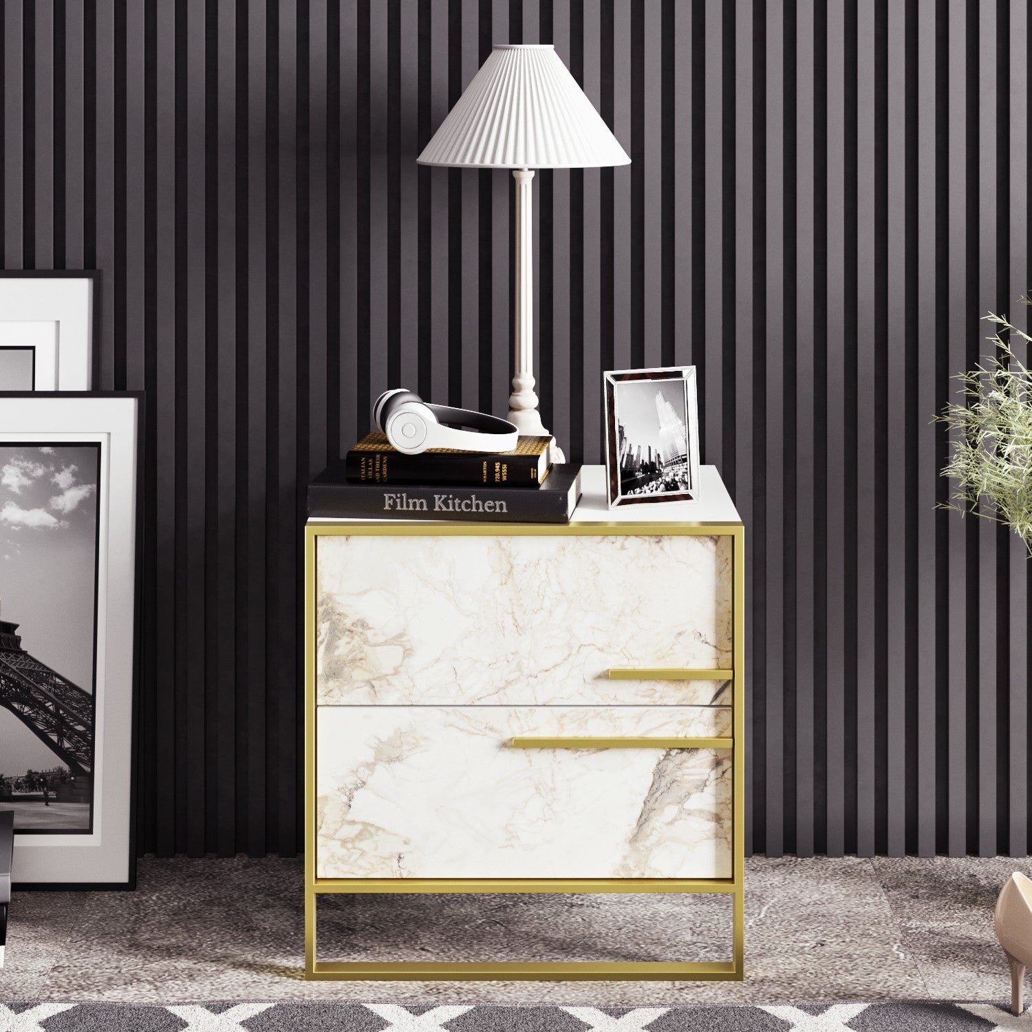 Mesa de cabeceira barroca, dourada e branca, 50 x 51,8 x 38,5 cm | Painel de partículas 100% revestido em melamina, 100% metal | Armazenamento elegante com padrão de mármore