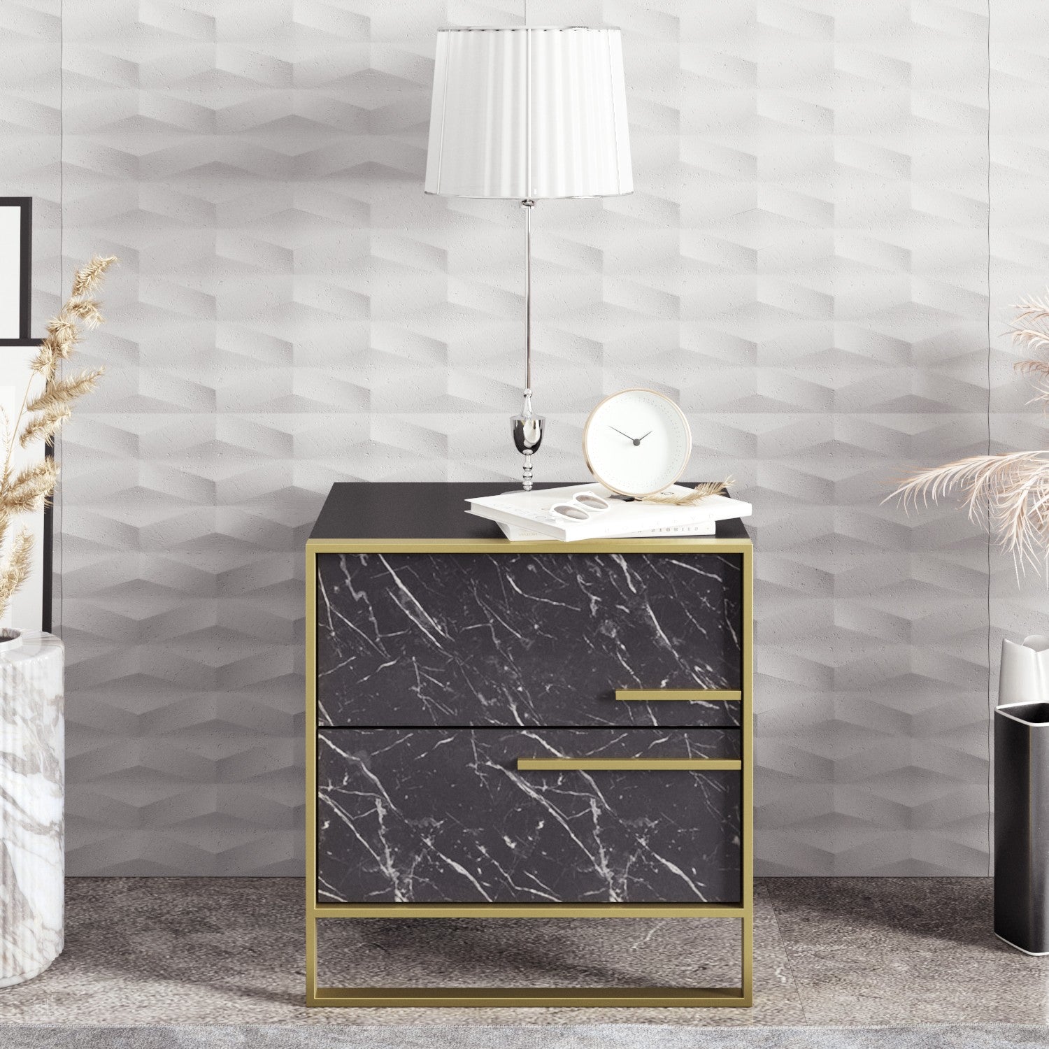 A nossa mesa de cabeceira foi concebida para complementar vários estilos de interiores, incluindo temas barrocos, glamorosos, hoteleiros e de mármore. O seu design elegante e intemporal combina facilmente com qualquer decoração, tornando-a uma adição versátil ao seu quarto.