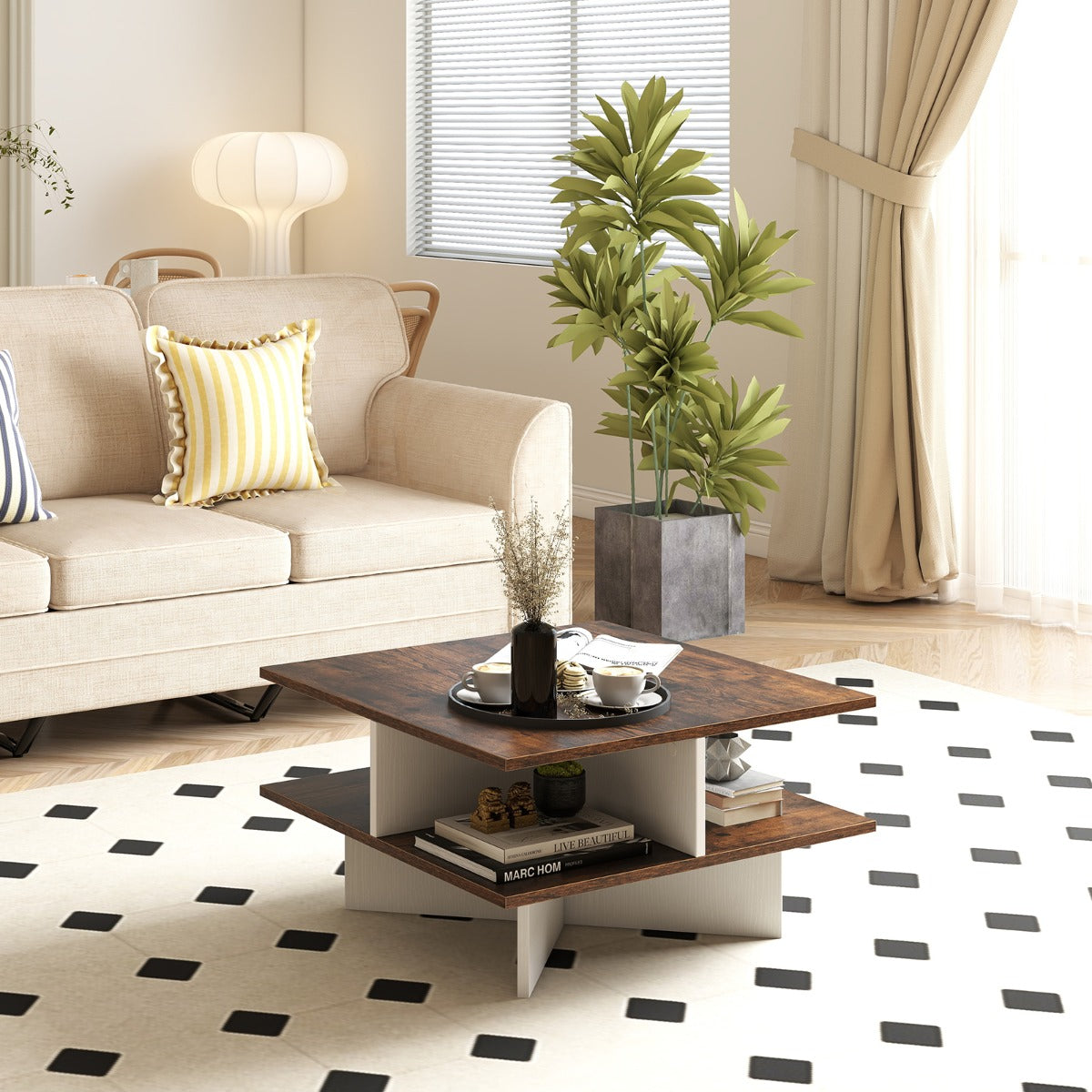 Mesa de Café Quadrada de 2 Níveis com 4 Compartimentos de Armazenamento Base em Forma de Cruz Castanho Rústico