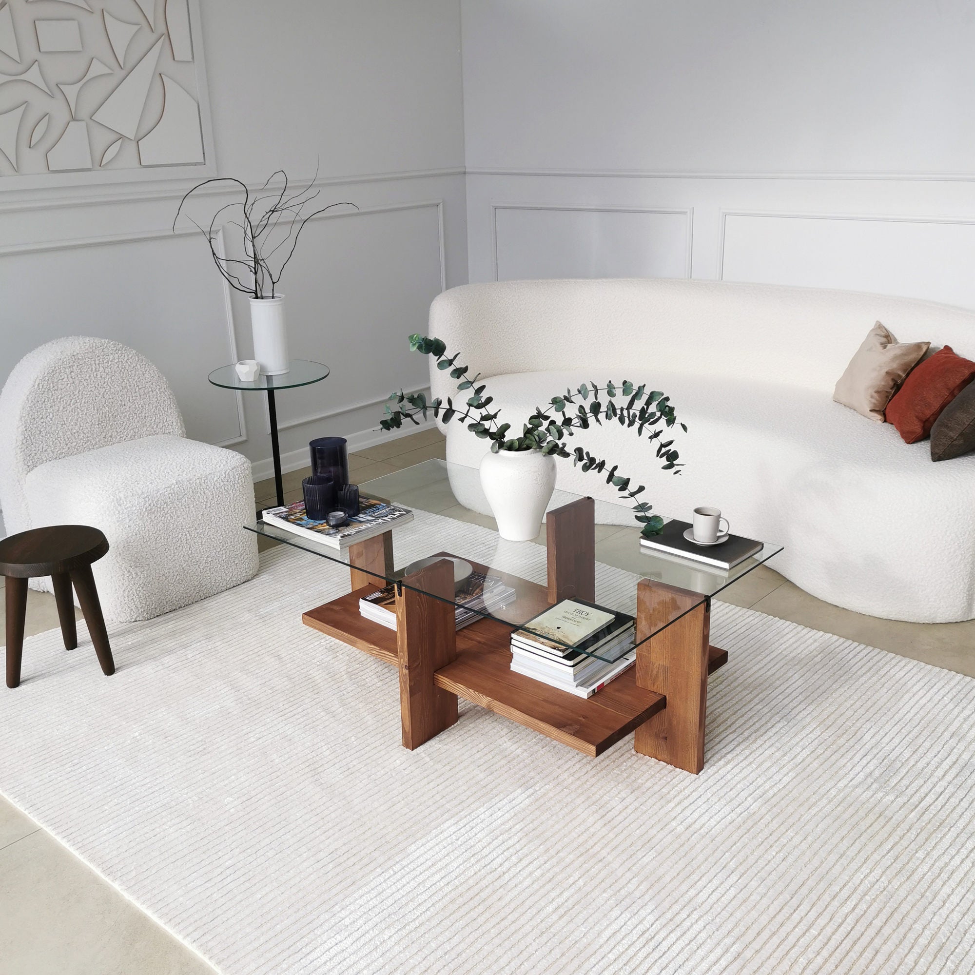 Mesa de Centro Elegante, 105 cm x 60 cm x 40 cm | Tampo 100% Vidro Temperado, Estrutura em Madeira Maciça | Design Rústico Moderno para Sala de Estar e Jantar