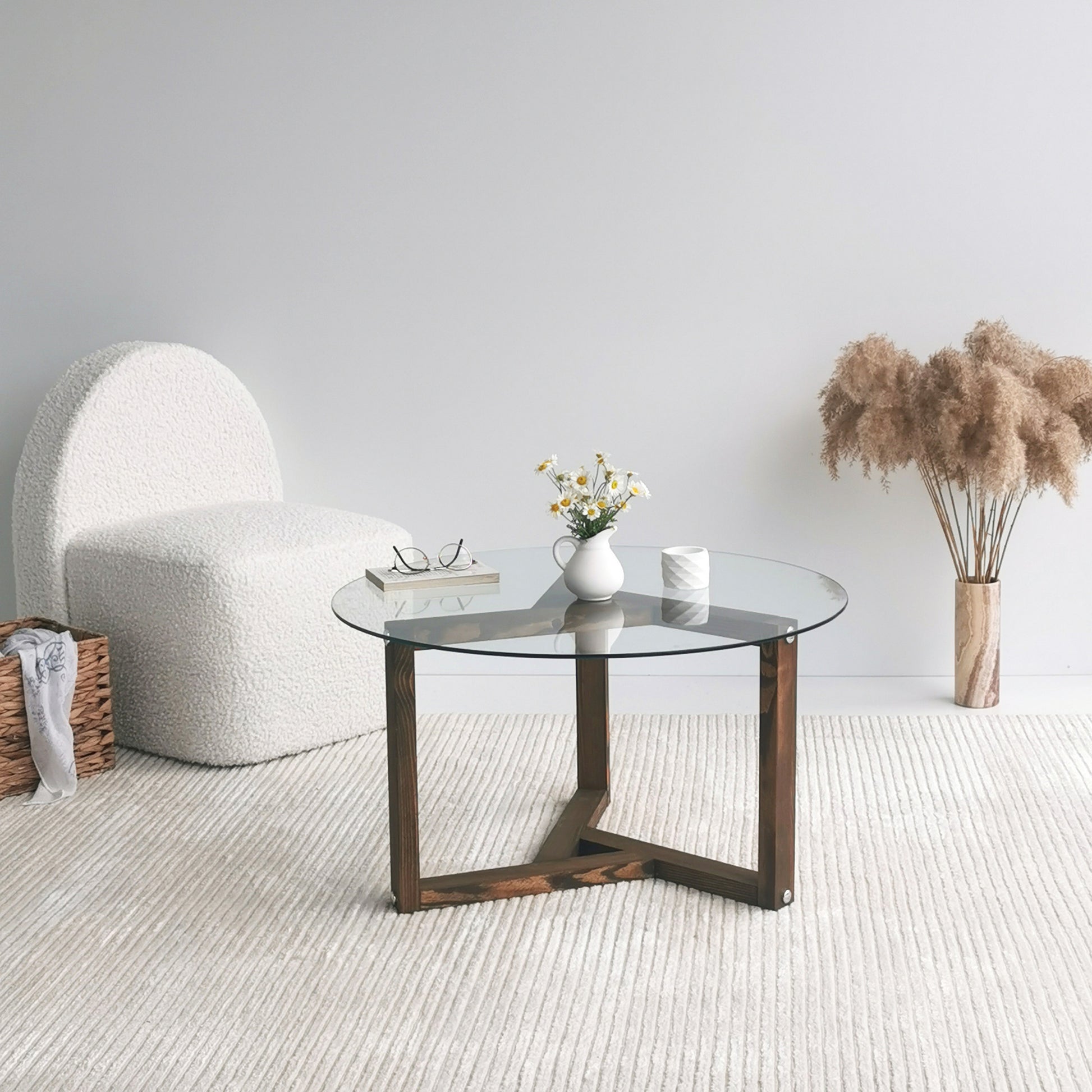 Mesa de Centro Moderna, Cor Nogueira, 75 x 75 x 40 cm | Tampo 100% Vidro Temperado, Estrutura 100% Madeira Maciça de Pinho | Design Rústico e Tradicional Montado