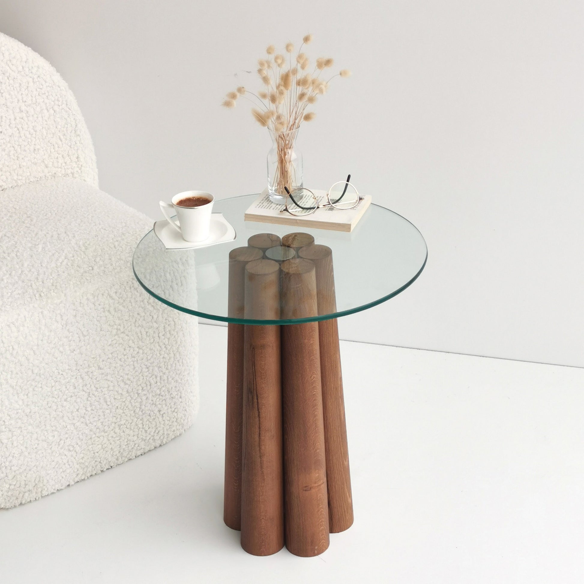 Mesa de Centro Moderna, Cor Nogueira, 45 x 50 x 50 cm | 100% Madeira Maciça de Pinho e Estrutura de Vidro Temperado, 8 mm de Espessura | Design Rústico Escandinavo, Montada