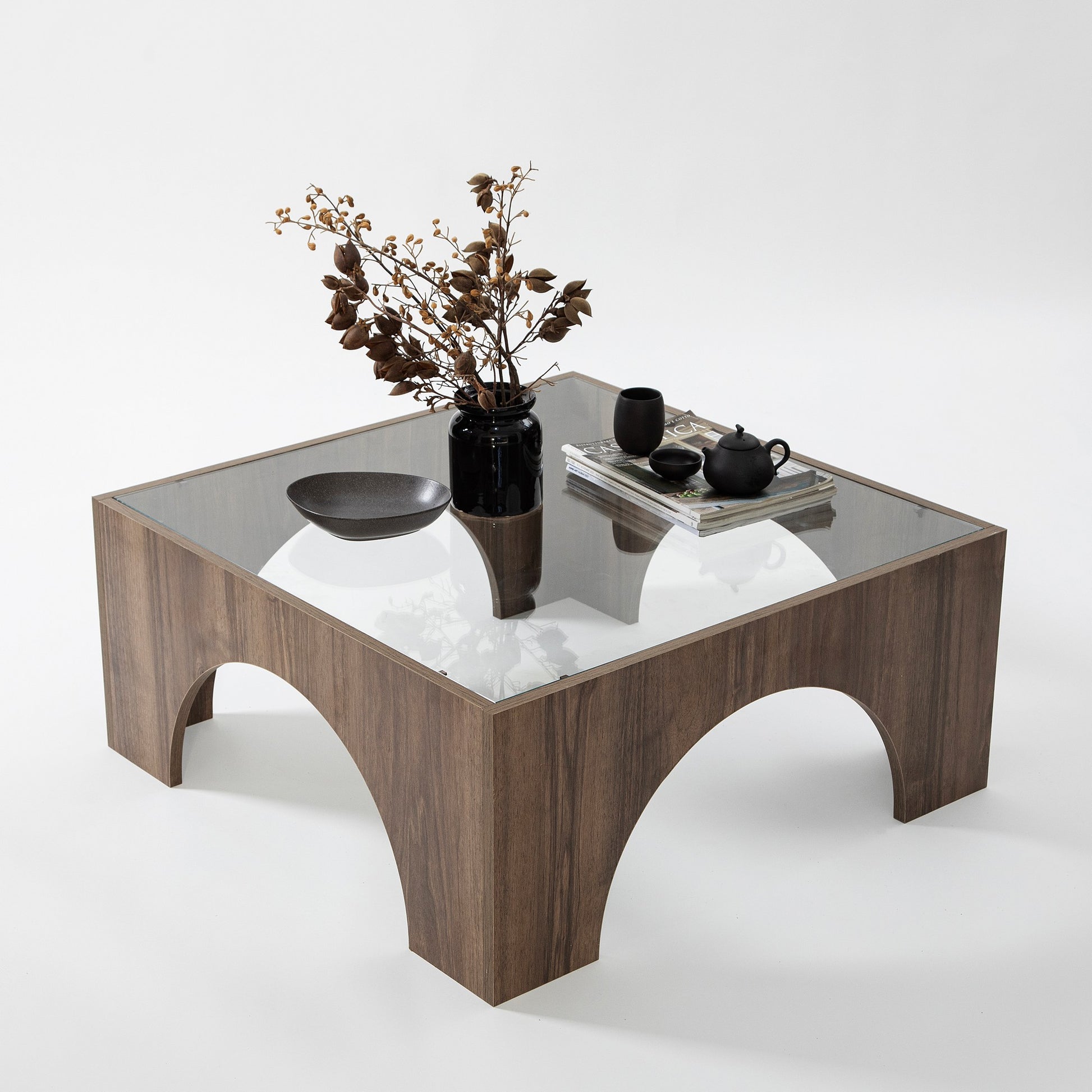 Mesa de Centro Elegante, 80 x 35 x 80 cm | 100% Vidro Temperado e Aglomerado de Melamina em Nogueira | Desmontada, Design Elegante para Espaços Modernos
