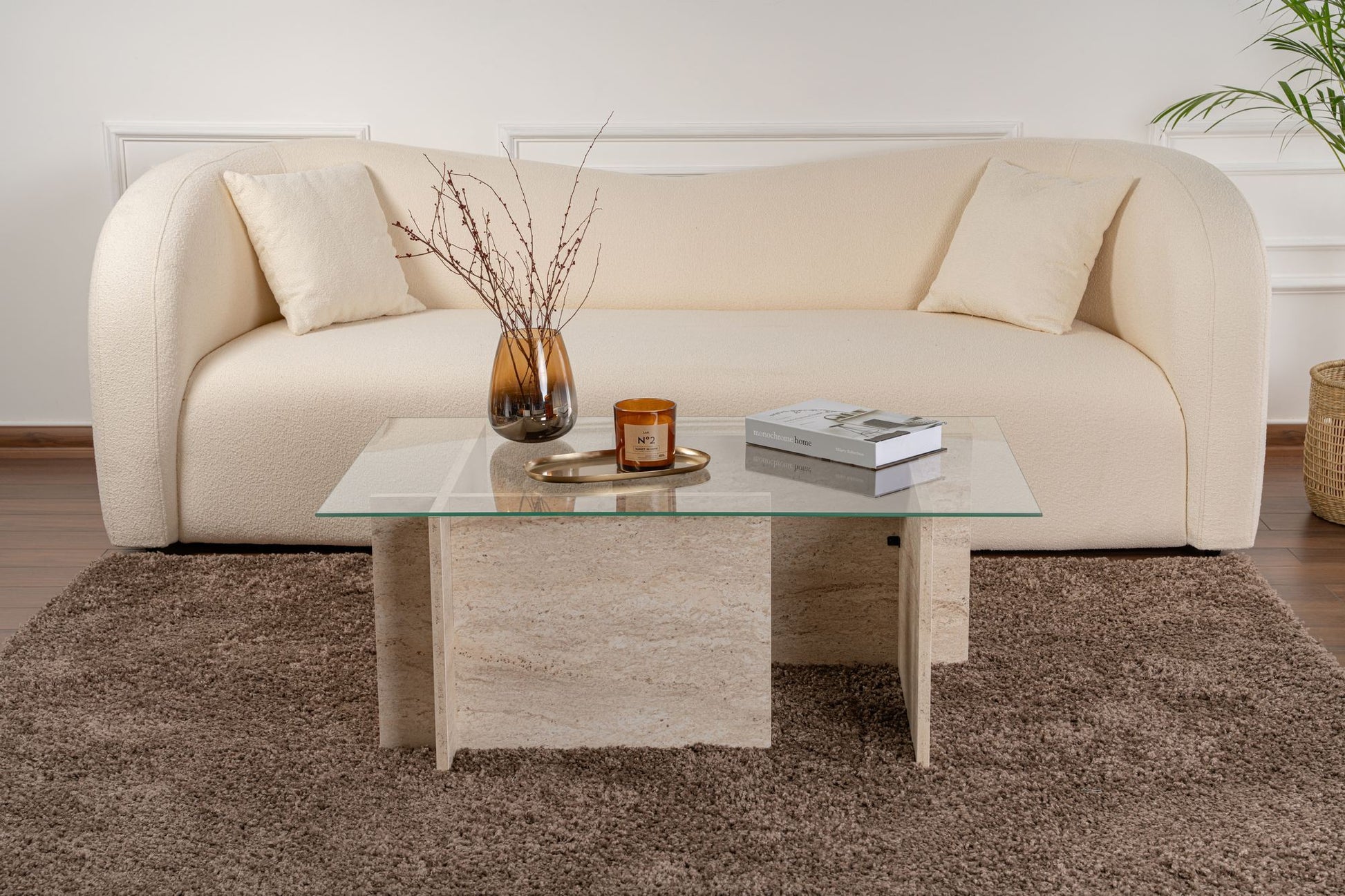Mesa de Centro Elegante, 105 cm, Cor Travertino | 100% Vidro Temperado e Aglomerado Revestido em Melamina, 18 mm de Espessura | Design Elegante em Mármore para Espaços Modernos