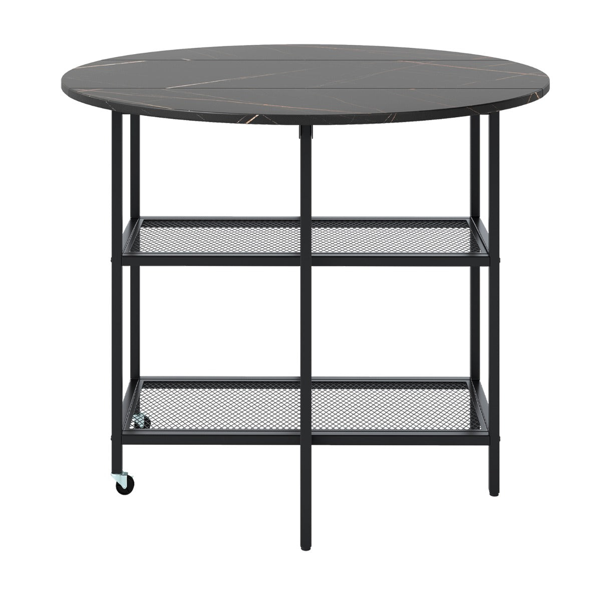Mesa de Jantar Dobrável Móvel com Mesa Redonda com Aba e 2 Prateleiras e Rodízios Bloqueáveis para Sala de Jantar ou Estar 100 x 100 x 80 cm Preto