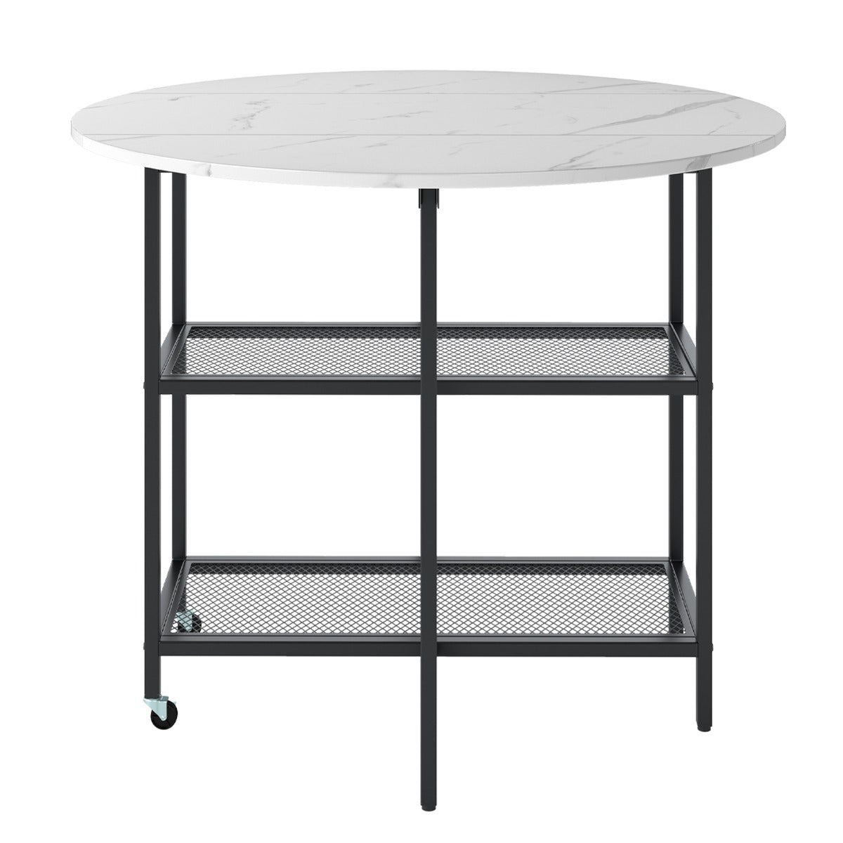 Características: Folhas duplas dobráveis com dobradiças de metal flexível oferecem 3 modos de utilização diferentes; Mesa ampla oferece espaço generoso para 2-4 pessoas jantarem; Prateleiras de armazenamento abertas de 2 níveis mantêm as suas revistas, petiscos e bebidas organizados; 2 rodas com travão garantem um rolamento suave e evitam movimentos indesejados quando bloqueadas; 4 almofadas de pé ajustáveis evitam oscilações em superfícies irregulares e protegem os pavimentos; Estrutura robusta de metal com revestimento em pó para maior durabilidade; O acabamento de mármore falso adiciona um toque de elegância e luxo.