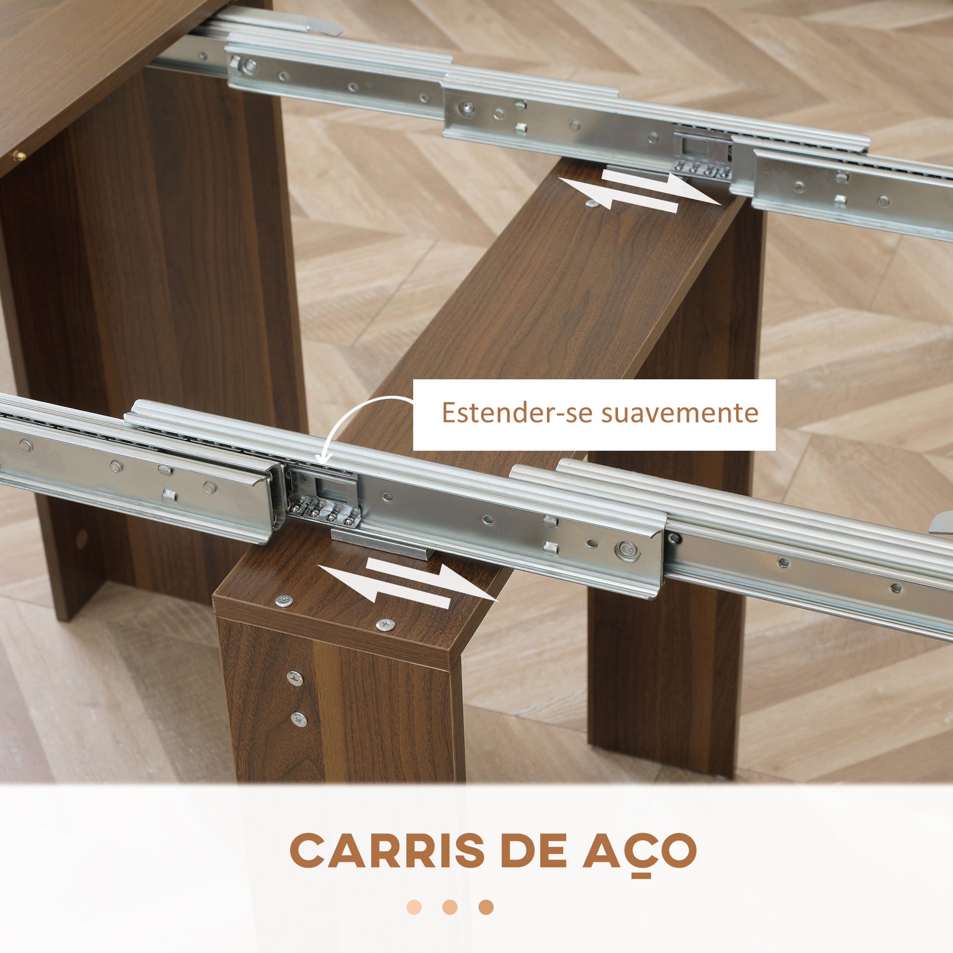 Esta mesa de jantar extensível é perfeita para espaços pequenos, ajustando-se de 60cm a 180cm e acomodando até 6 pessoas. Reduz facilmente ao tamanho de uma mesa lateral, ocupando pouco espaço quando dobrada.
