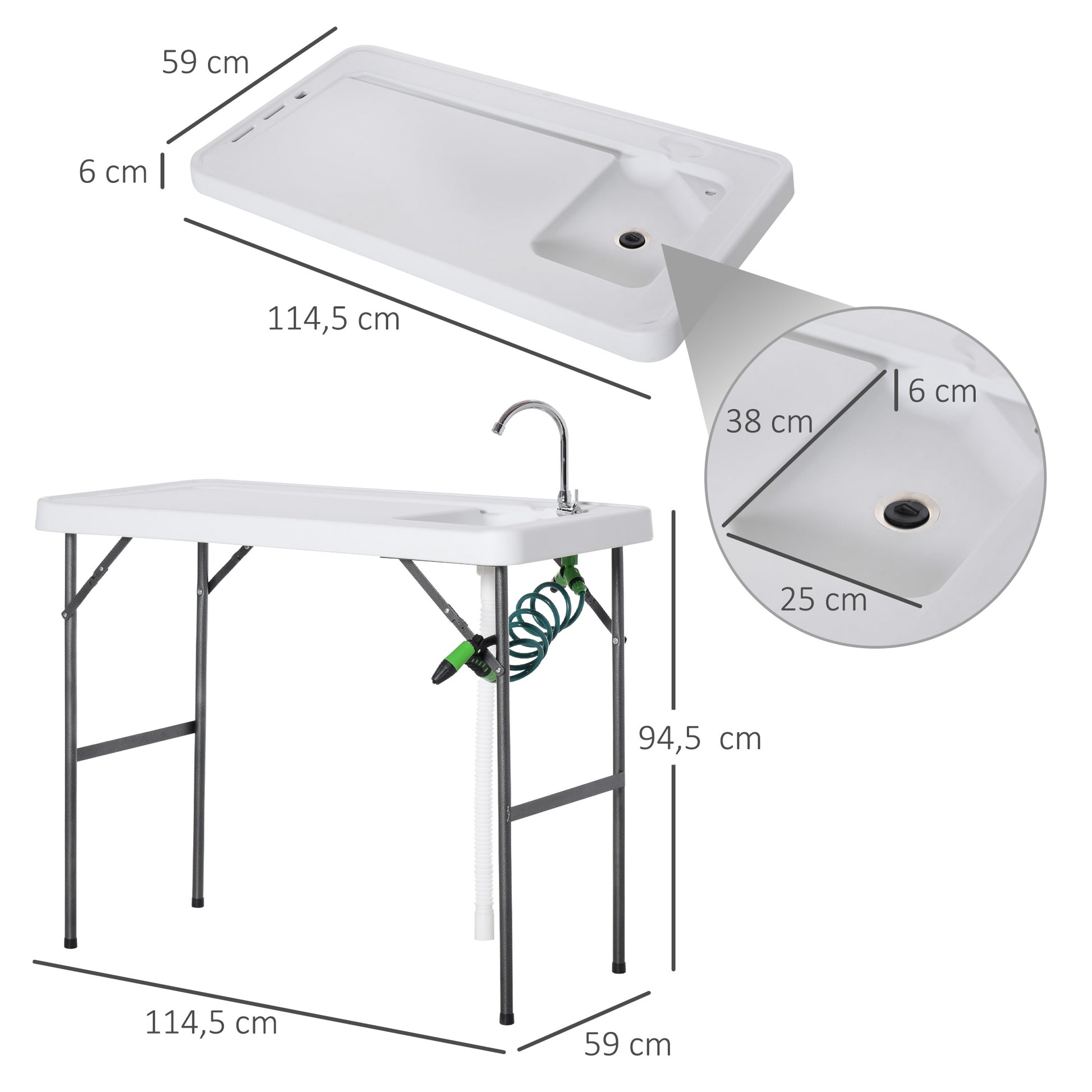 Desfrute de momentos ao ar livre com praticidade com esta mesa de piquenique dobrável em branco, equipada com pia e pistola de irrigação extensível.